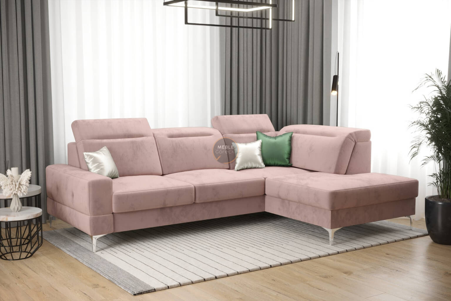Rohová sedačka má nastavitelné, vícestupňové opěrky hlavy, chromované ozdobné nožky, sedáky s ozdobným prošíváním, které jsou vyrobeny na vlnitých pružinách a vysoce elastické pěně, což zajišťuje vysoký komfort používání a zabraňuje deformaci nejčastěji používaných ploch.