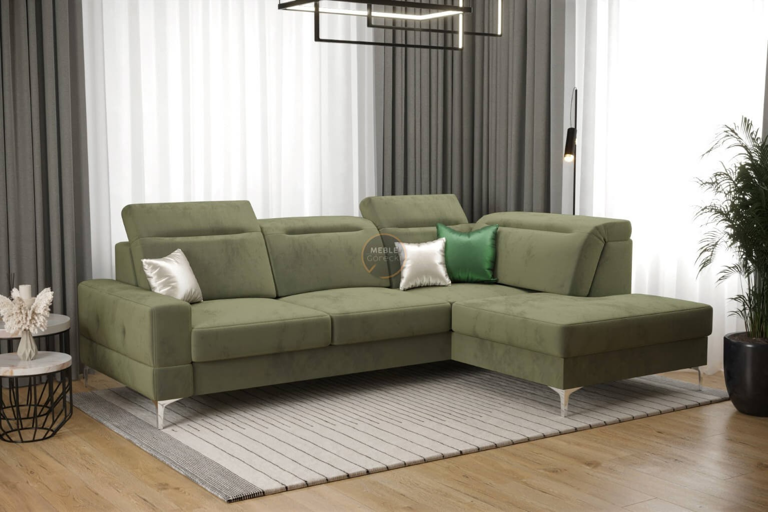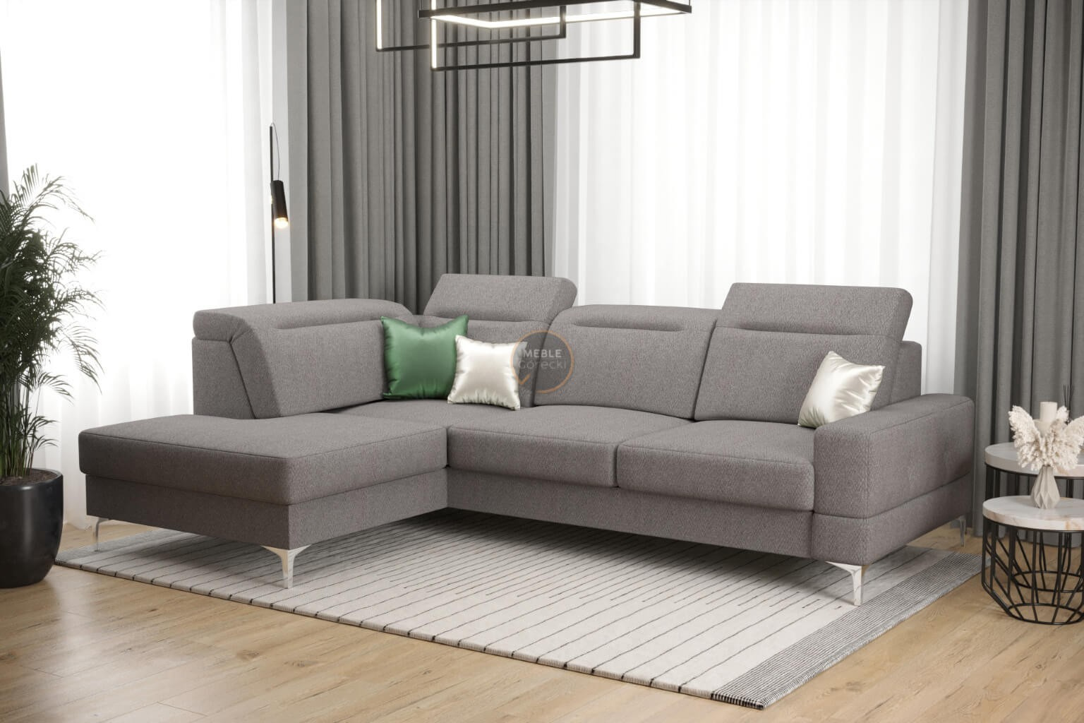 Rohová sedačka má nastavitelné, vícestupňové opěrky hlavy, chromované ozdobné nožky, sedáky s ozdobným prošíváním, které jsou vyrobeny na vlnitých pružinách a vysoce elastické pěně, což zajišťuje vysoký komfort používání a zabraňuje deformaci nejčastěji používaných ploch.