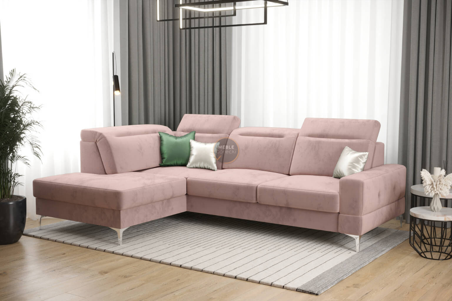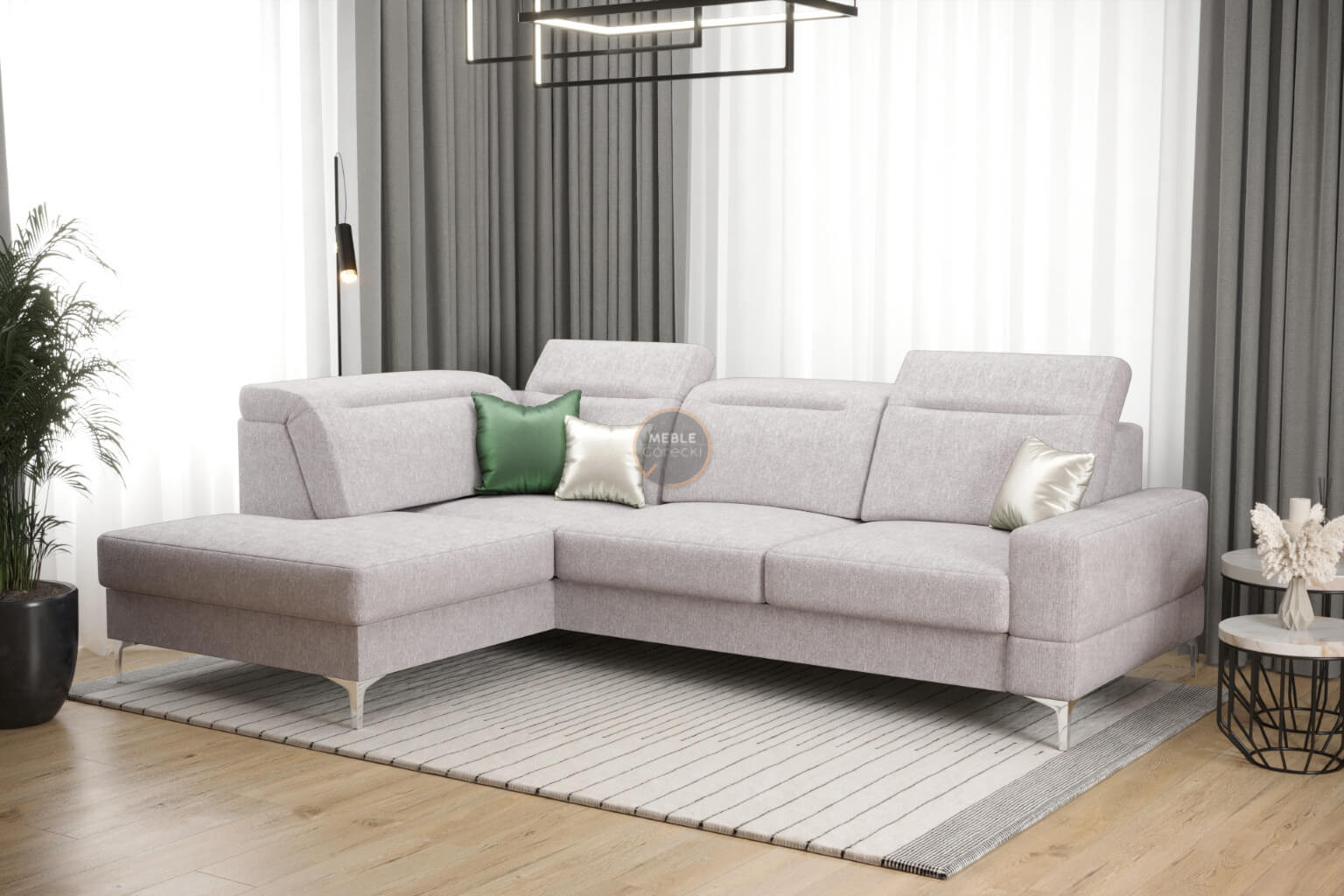 Rohová sedačka má nastavitelné, vícestupňové opěrky hlavy, chromované ozdobné nožky, sedáky s ozdobným prošíváním, které jsou vyrobeny na vlnitých pružinách a vysoce elastické pěně, což zajišťuje vysoký komfort používání a zabraňuje deformaci nejčastěji používaných ploch.