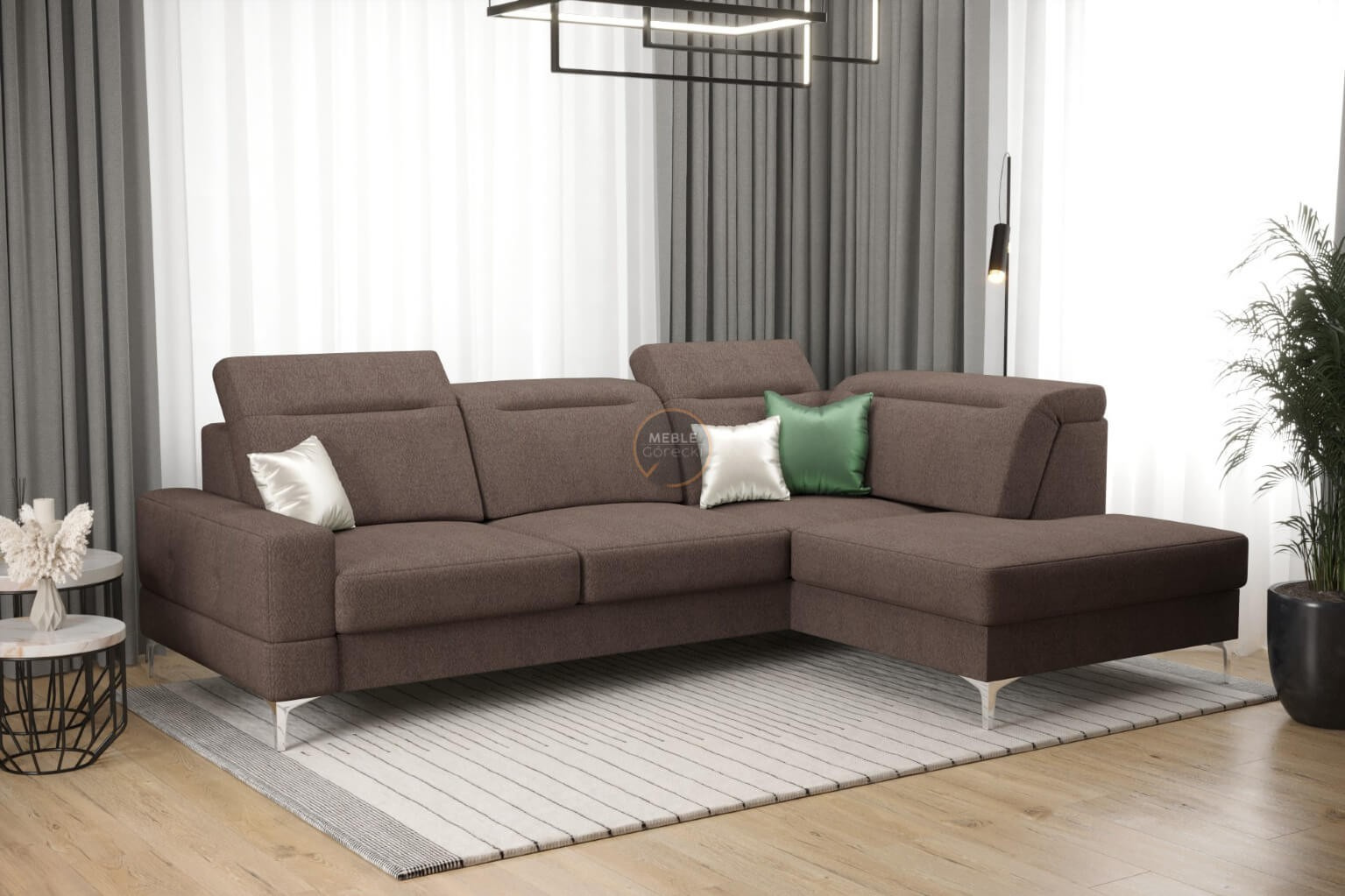 Rohová sedačka má nastavitelné, vícestupňové opěrky hlavy, chromované ozdobné nožky, sedáky s ozdobným prošíváním, které jsou vyrobeny na vlnitých pružinách a vysoce elastické pěně, což zajišťuje vysoký komfort používání a zabraňuje deformaci nejčastěji používaných ploch.