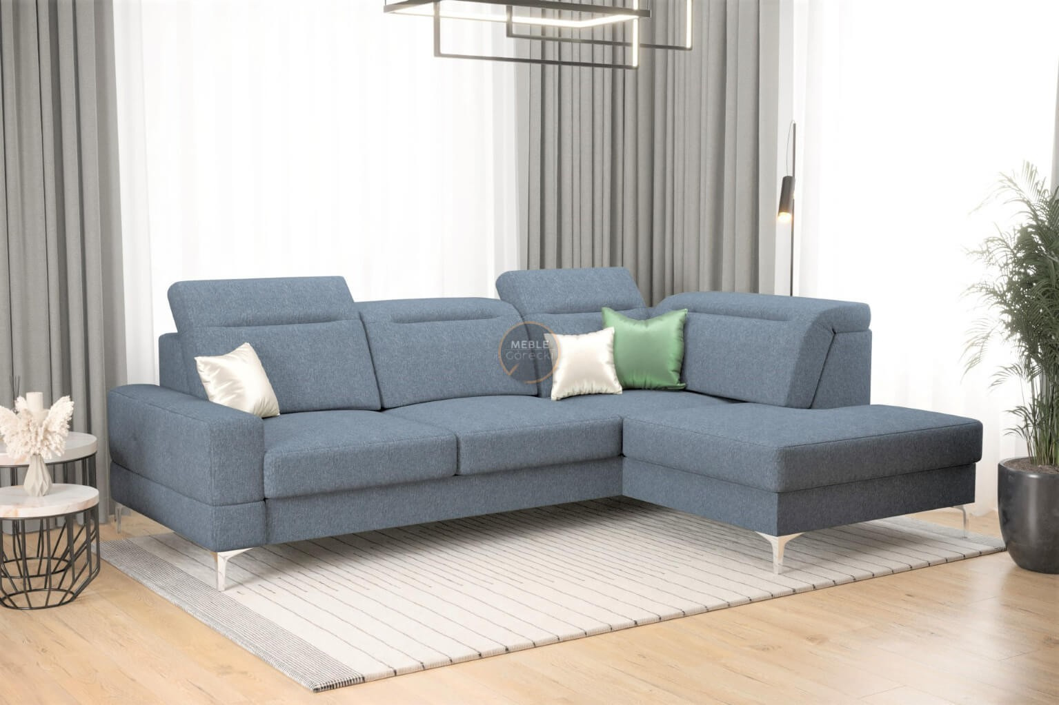 Rohová sedačka má nastavitelné, vícestupňové opěrky hlavy, chromované ozdobné nožky, sedáky s ozdobným prošíváním, které jsou vyrobeny na vlnitých pružinách a vysoce elastické pěně, což zajišťuje vysoký komfort používání a zabraňuje deformaci nejčastěji používaných ploch.