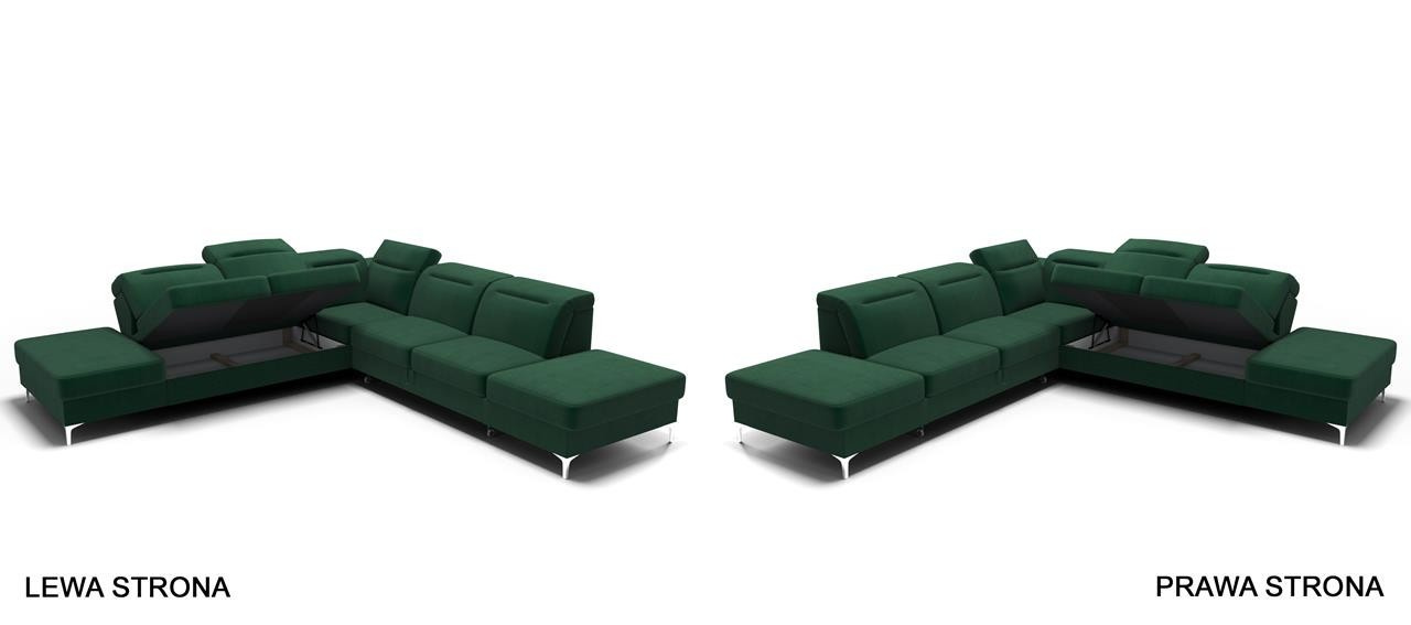 Rohová sedačka má nastavitelné, vícestupňové opěrky hlavy, chromované ozdobné nožky, sedáky s ozdobným prošíváním, které jsou vyrobeny na vlnitých pružinách a vysoce elastické pěně, což zajišťuje vysoký komfort používání a zabraňuje deformaci nejčastěji používaných ploch. Stranu rohové sedačky určuje úložný prostor na lůžkoviny. Kontejner vpravo - pravá strana, kontejner vlevo - levá strana (stojíc čelem k nábytku).