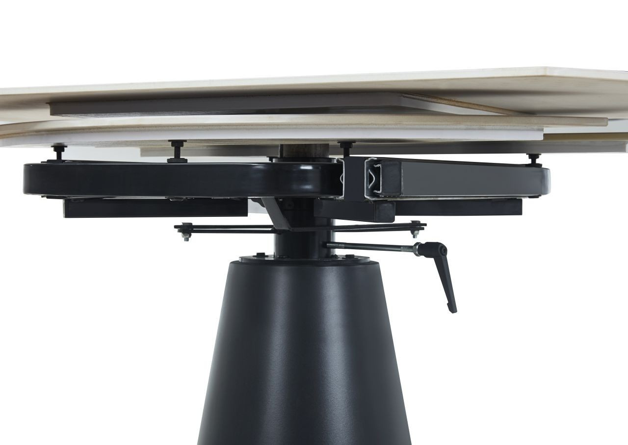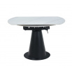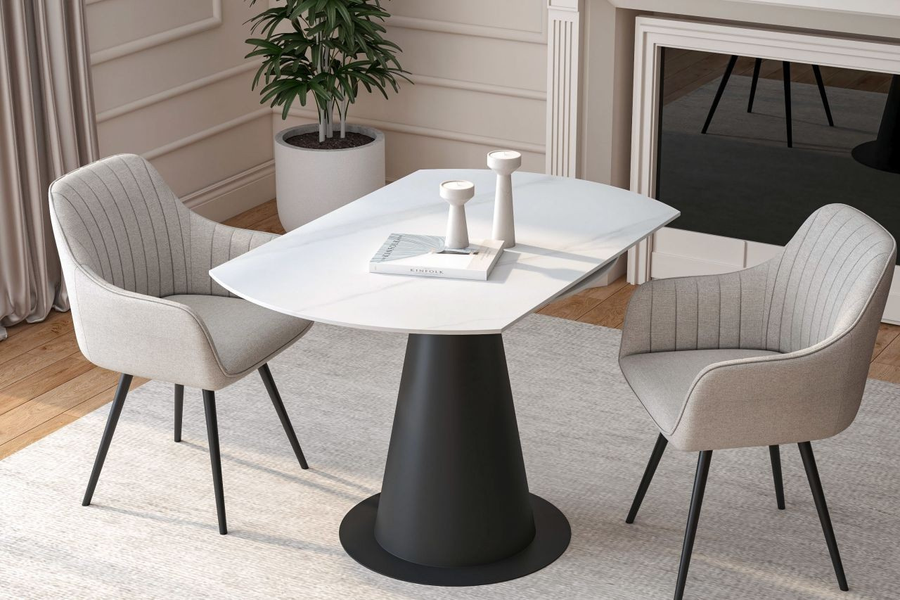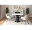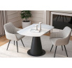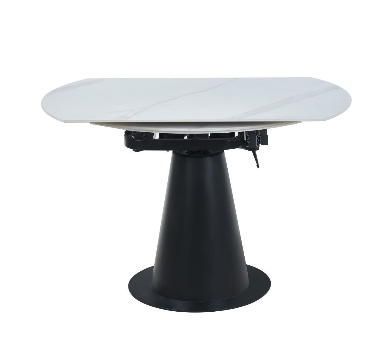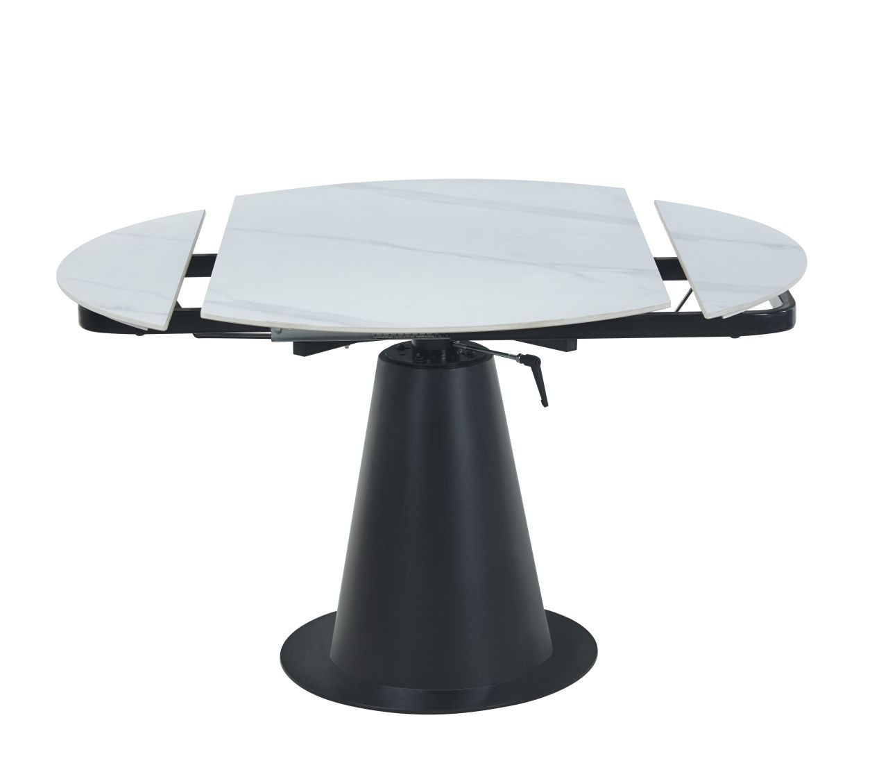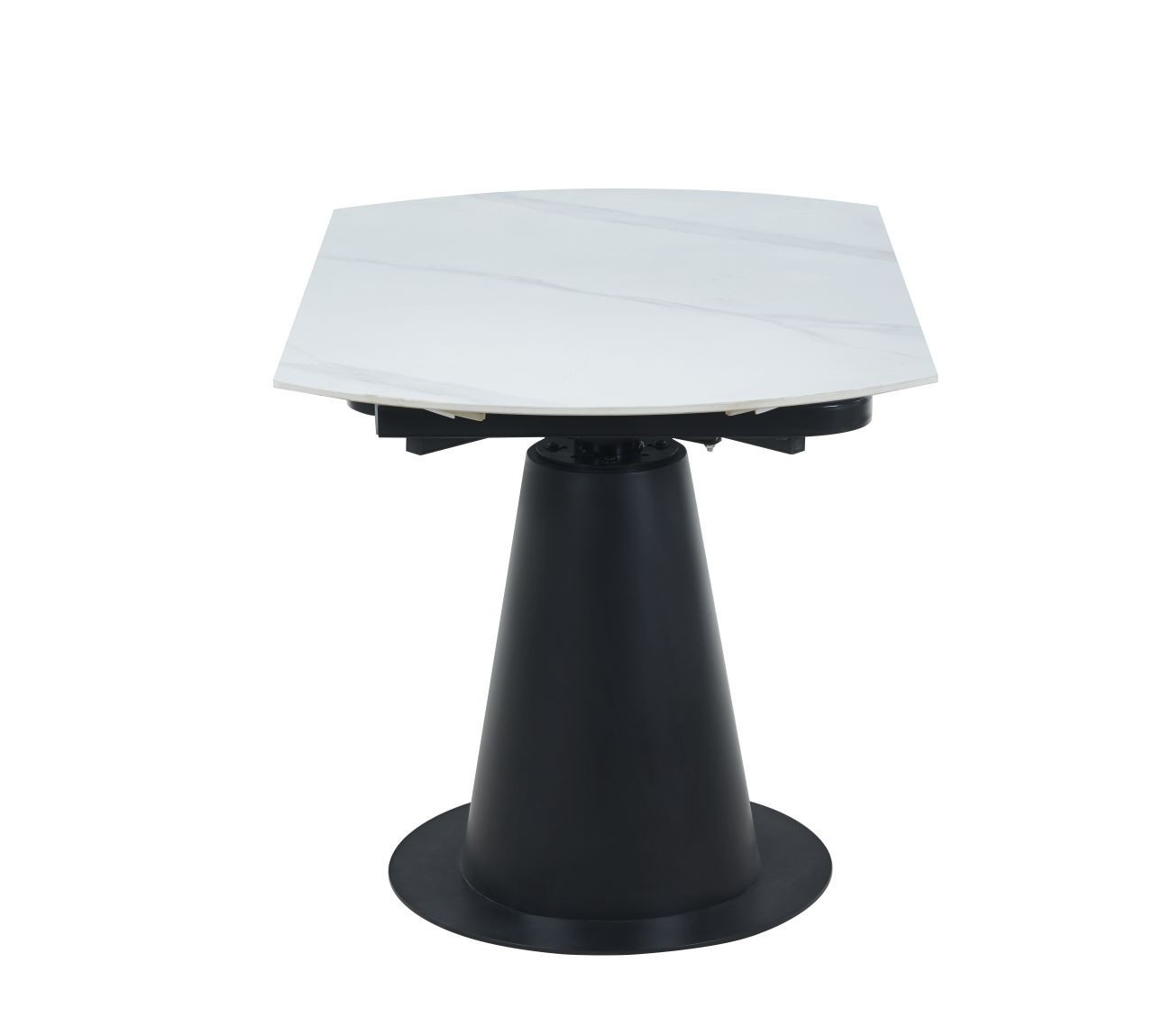 Rozměry: - délka: 75 cm (po rozložení 120 cm) - šířka: 120 cm - výška: 76 cm Materiál: - deska: keramika + MDF - základna + rám: kov lakovaný práškovou barvou Barva: - bílý mramor + černá Další: - rozkládání: synchronní otočný mechanismus (vysouvání 2 vnějších vložek)