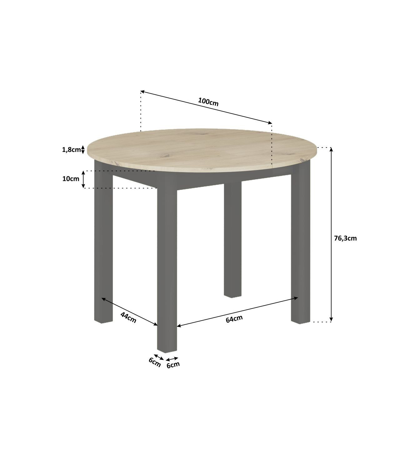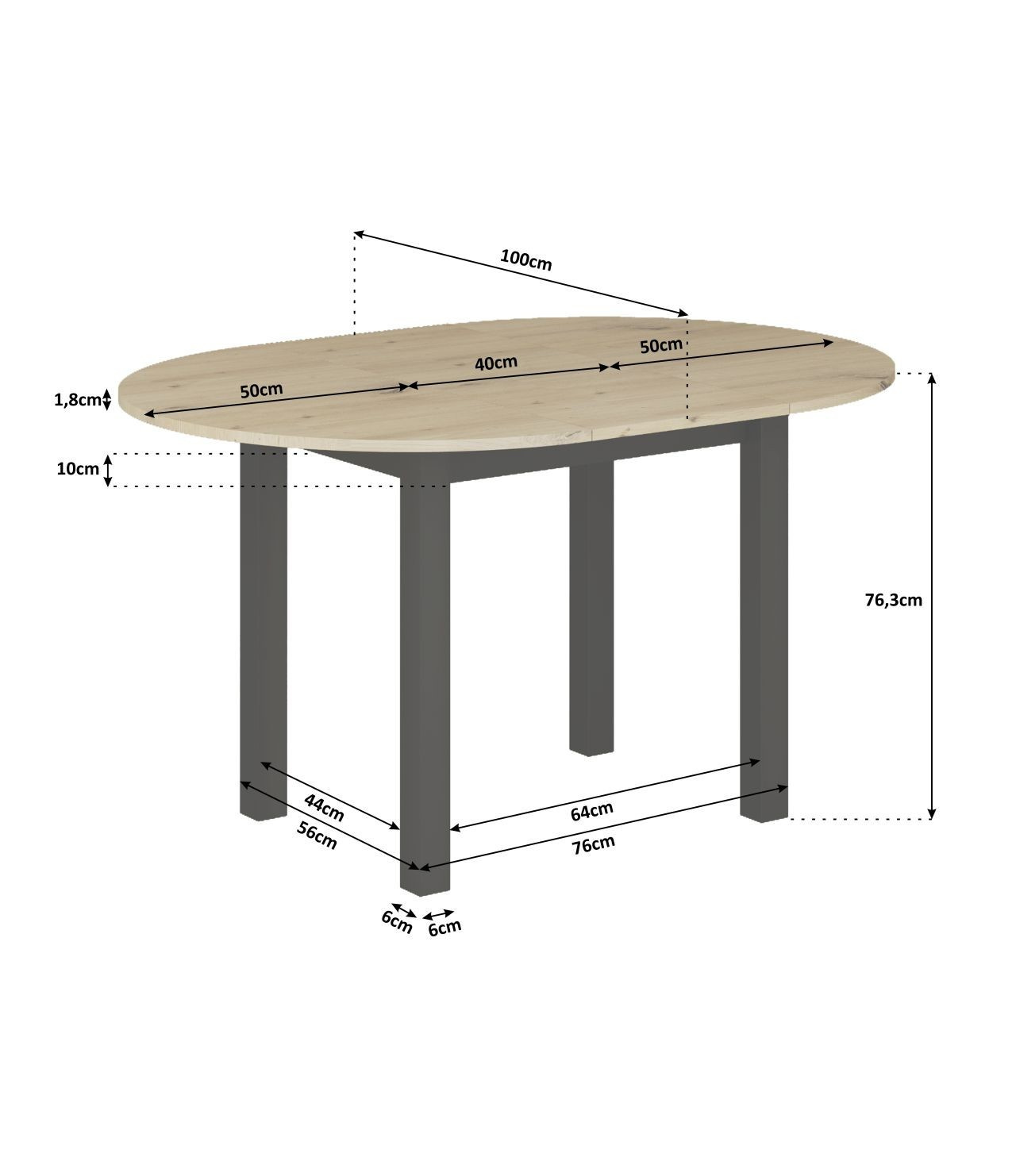 Rozměry: - délka: 100 cm (po rozložení 140 cm) - šířka: 100 cm - výška: 76 cm - tloušťka desky: 1,8 cm - vložka: 100x40 cm - podrobné rozměry na posledních fotografiích Materiál: - deska + základna: laminovaná deska, hrany ABS - nohy: MDF Barva: - dub artisan + černá