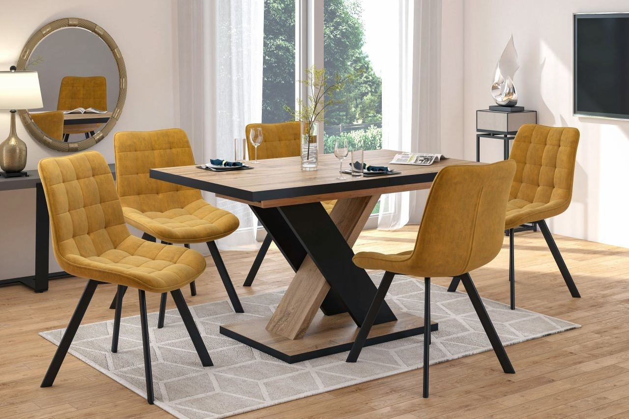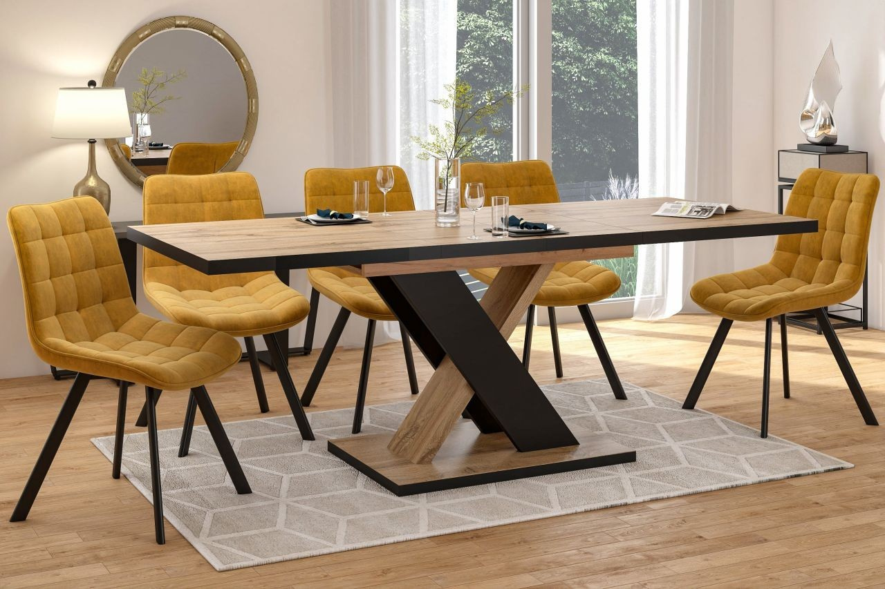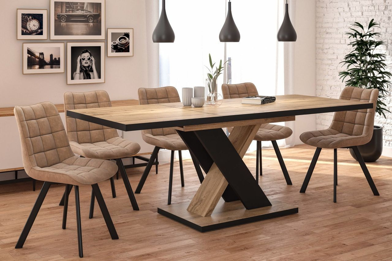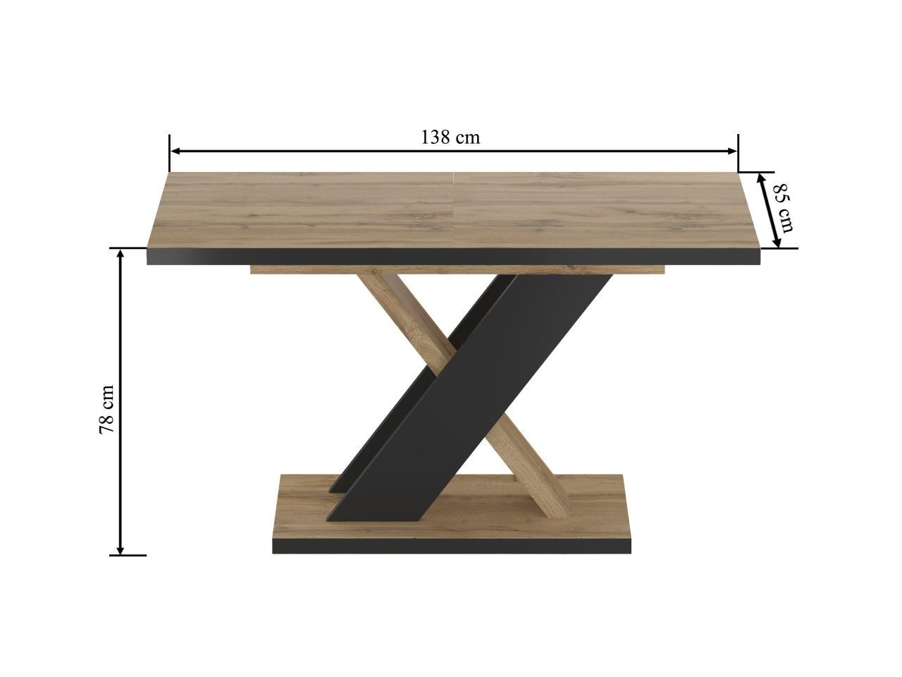 Rozměry: - délka: 138 cm (po rozložení 208 cm) - šířka: 85 cm - výška: 78 cm - tloušťka desky: 2,8 cm - tloušťka vložky: 2,8 cm Materiál: - deska: laminovaná dřevotříska - nohy: laminovaná dřevotříska Barva: - dub wotan + černá