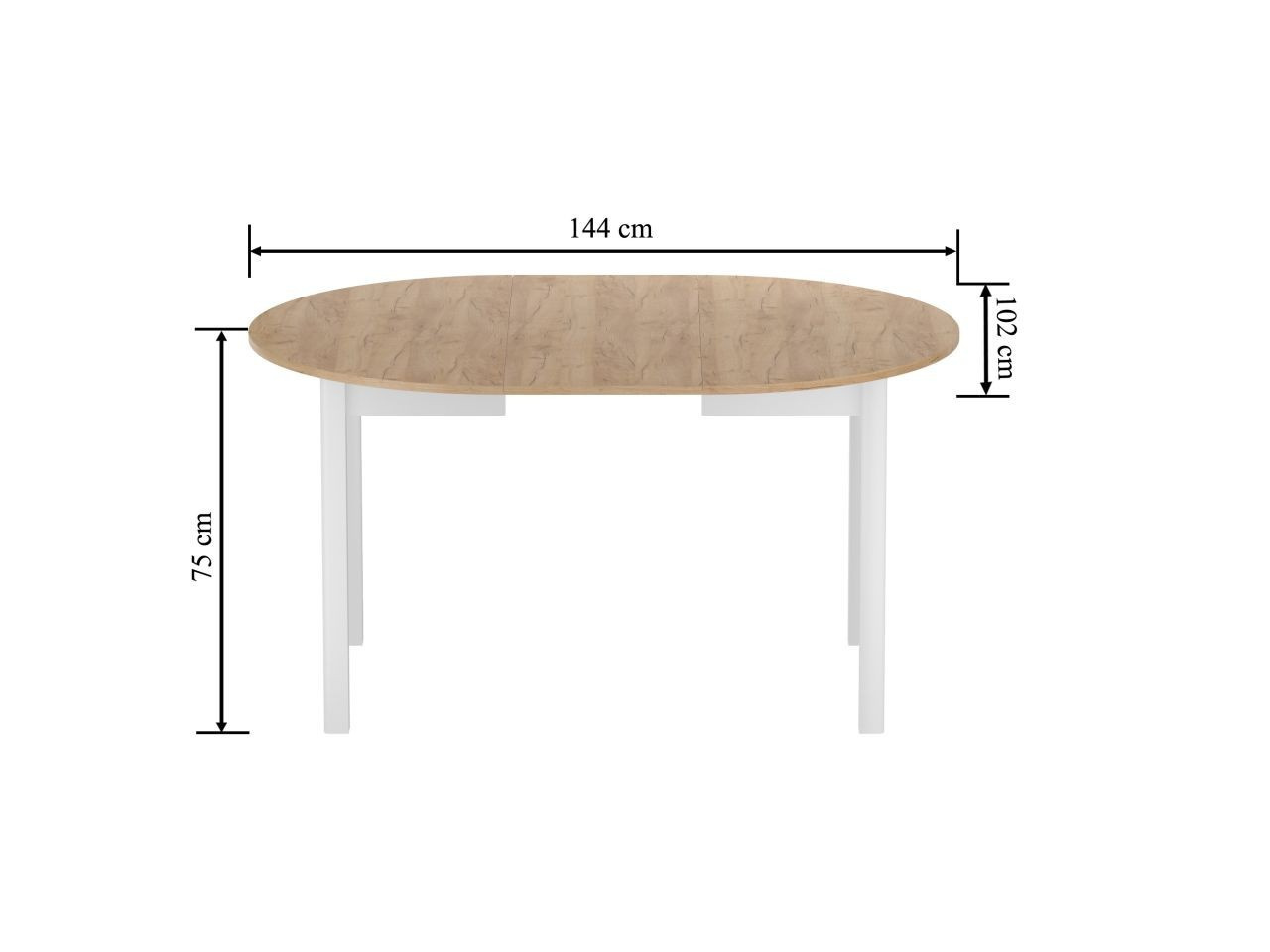 Rozměry: - délka: 100 cm (po rozložení 140 cm) - šířka: 100 cm - výška: 75 cm - tloušťka desky: 1,8 cm - vložka: 100x40 cm Materiál: - deska + základna: laminovaná deska, hrany ABS - nohy: MDF Barva: - zlatý dub craft + bílá