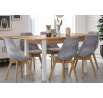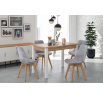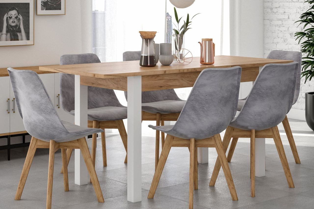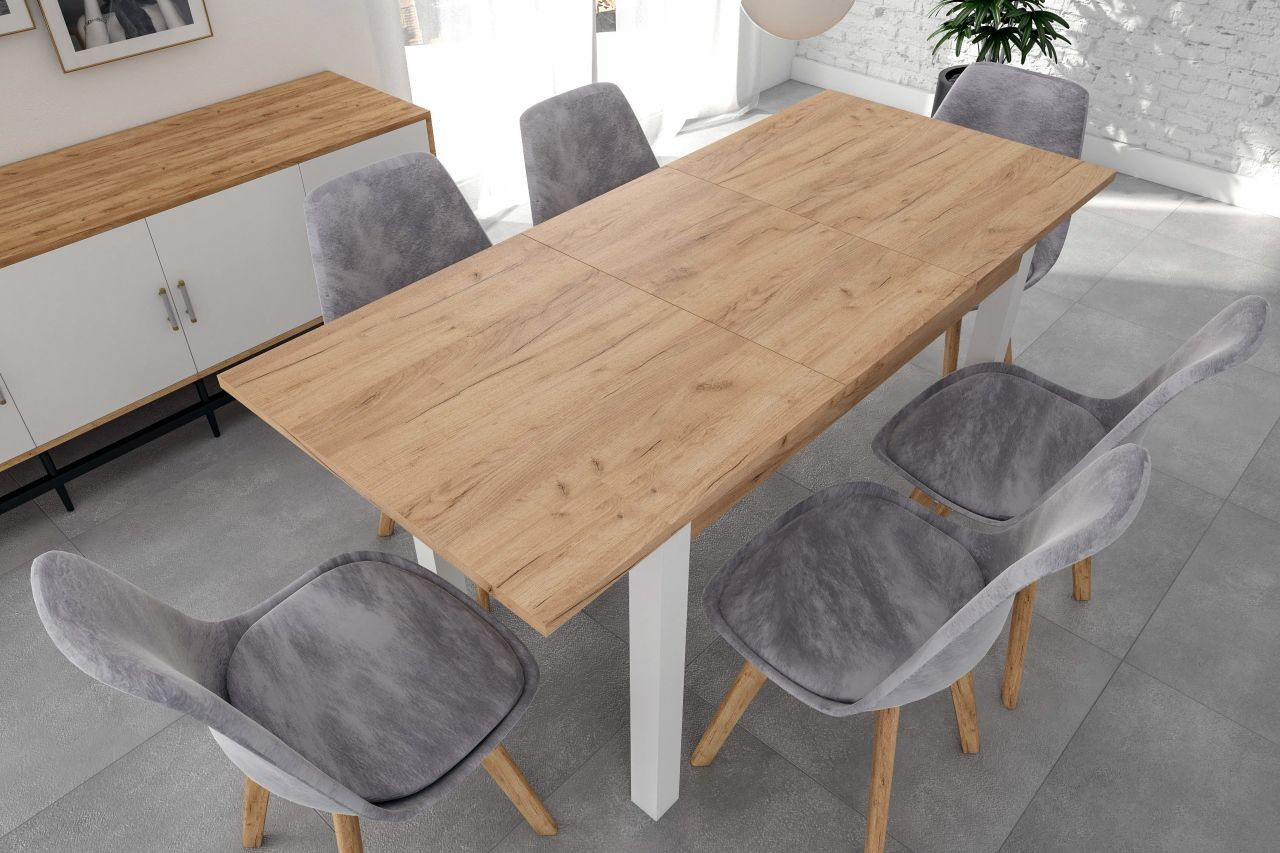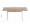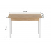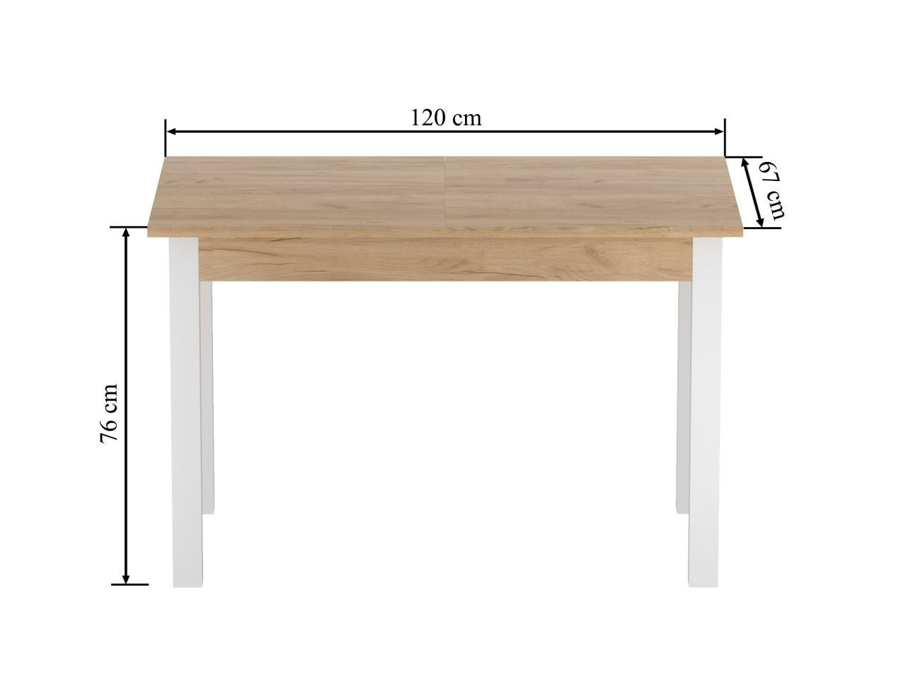 Rozměry: - délka: 120 cm (po rozložení 160 cm) - šířka: 67 cm - výška: 76 cm - tloušťka desky: 2,2 cm Materiál: - deska + vložka: laminovaná deska - nohy: MDF - hrany desky: zakončené ABS plastem Barva: - dub zlatý craft + bílá