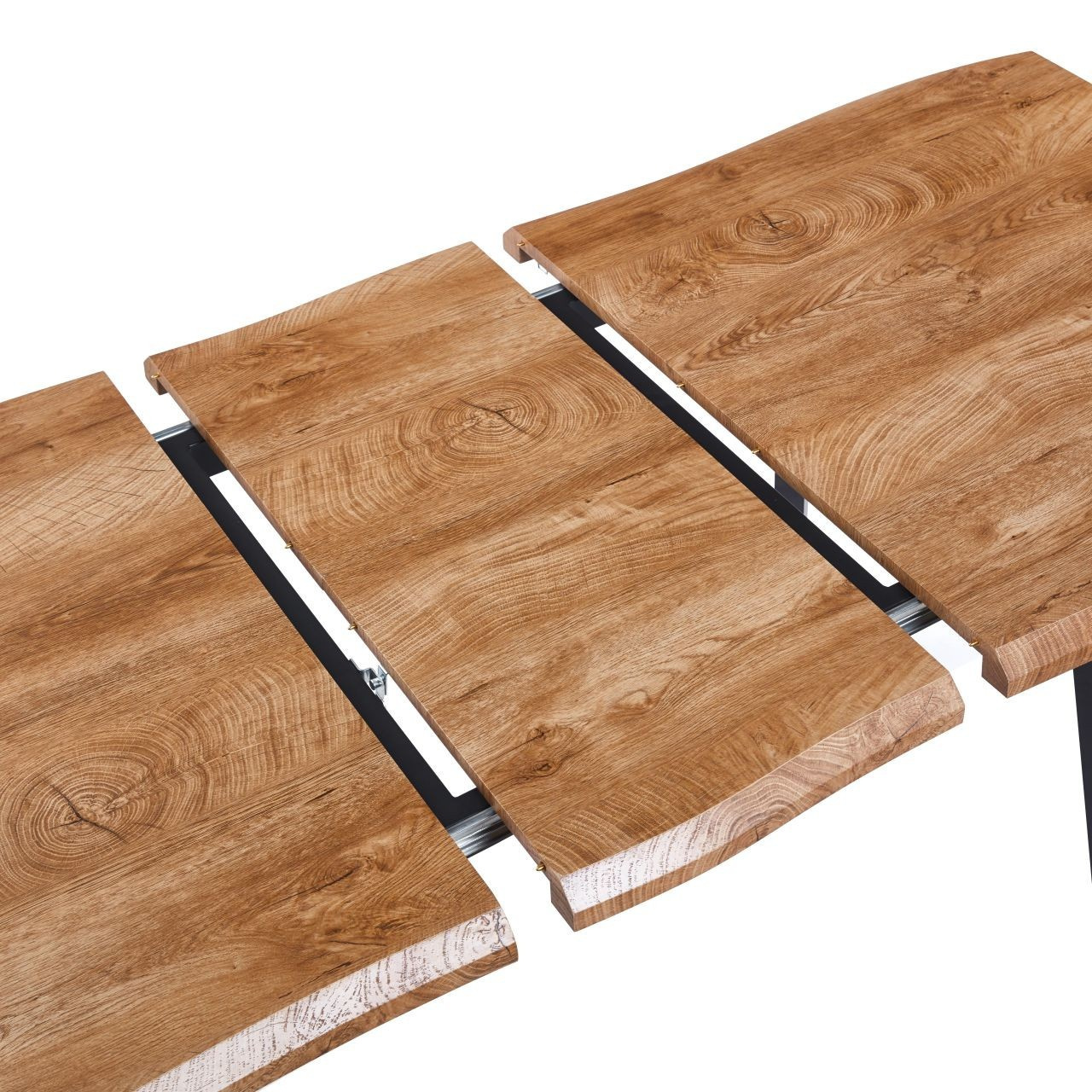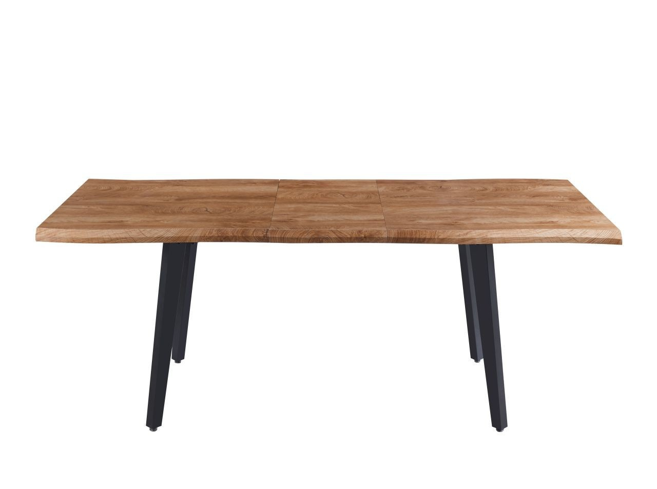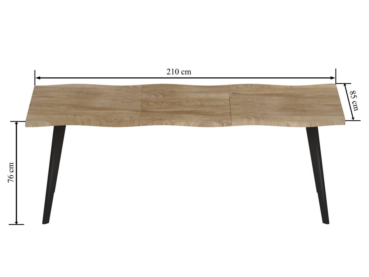Rozměry: - délka: 150 cm (po rozložení 210 cm) - šířka: 85 cm - výška: 76 cm Materiál: - deska: MDF dýhovaná - nohy: ocel lakovaná práškovou barvou Barva: - deska: přírodní dub - nohy: černé