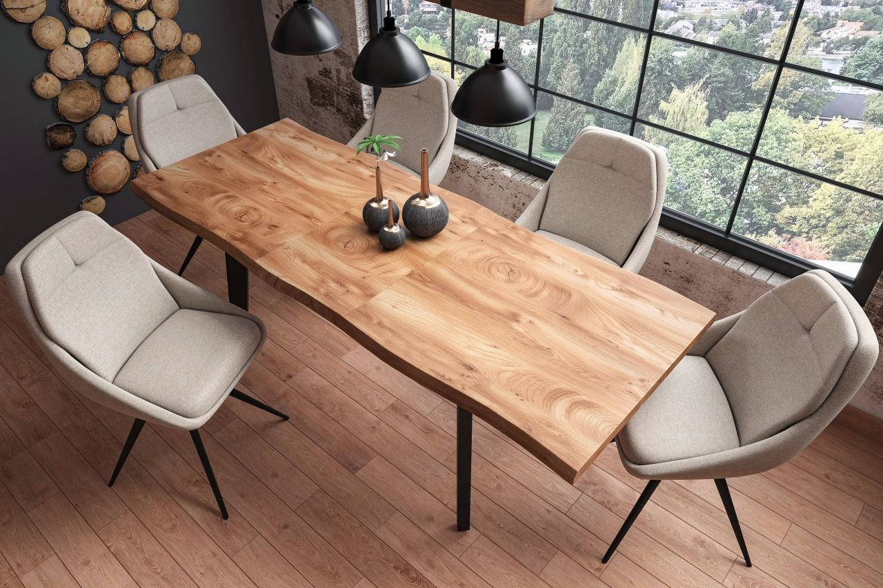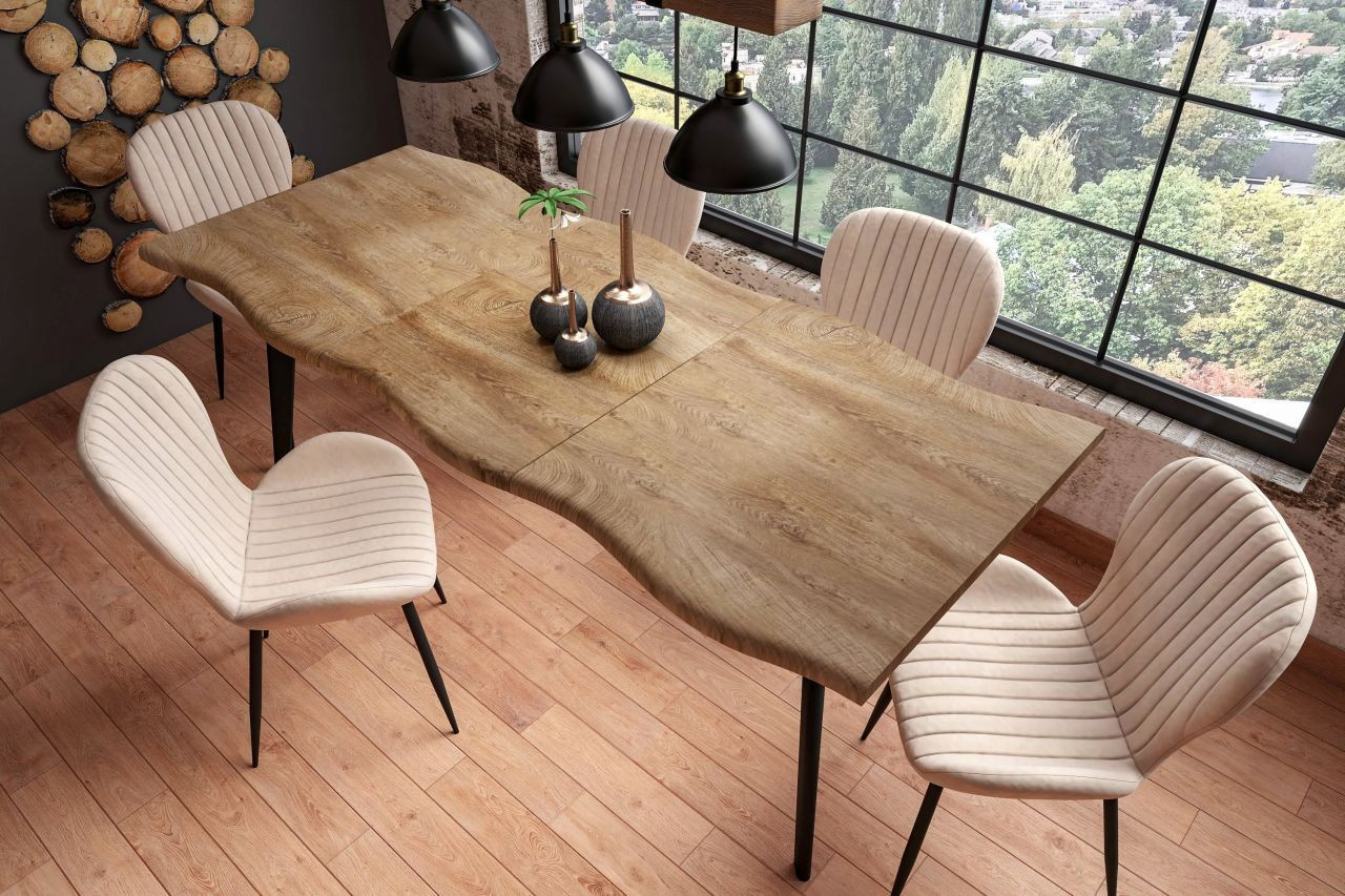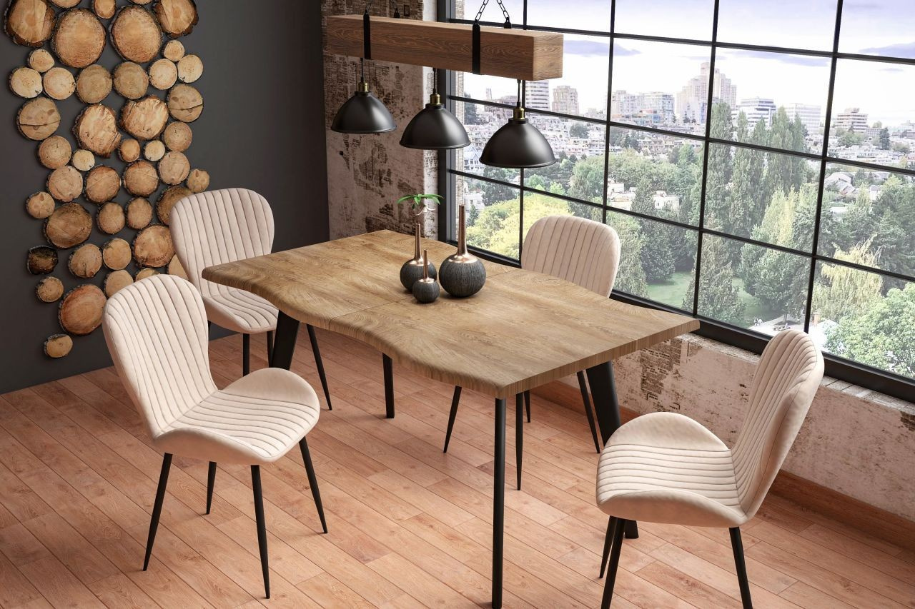 Rozměry: - délka: 150 cm (po rozložení 210 cm) - šířka: 85 cm - výška: 76 cm Materiál: - deska: MDF dýhovaná - nohy: ocel lakovaná práškovou barvou Barva: - deska: přírodní dub - nohy: černé