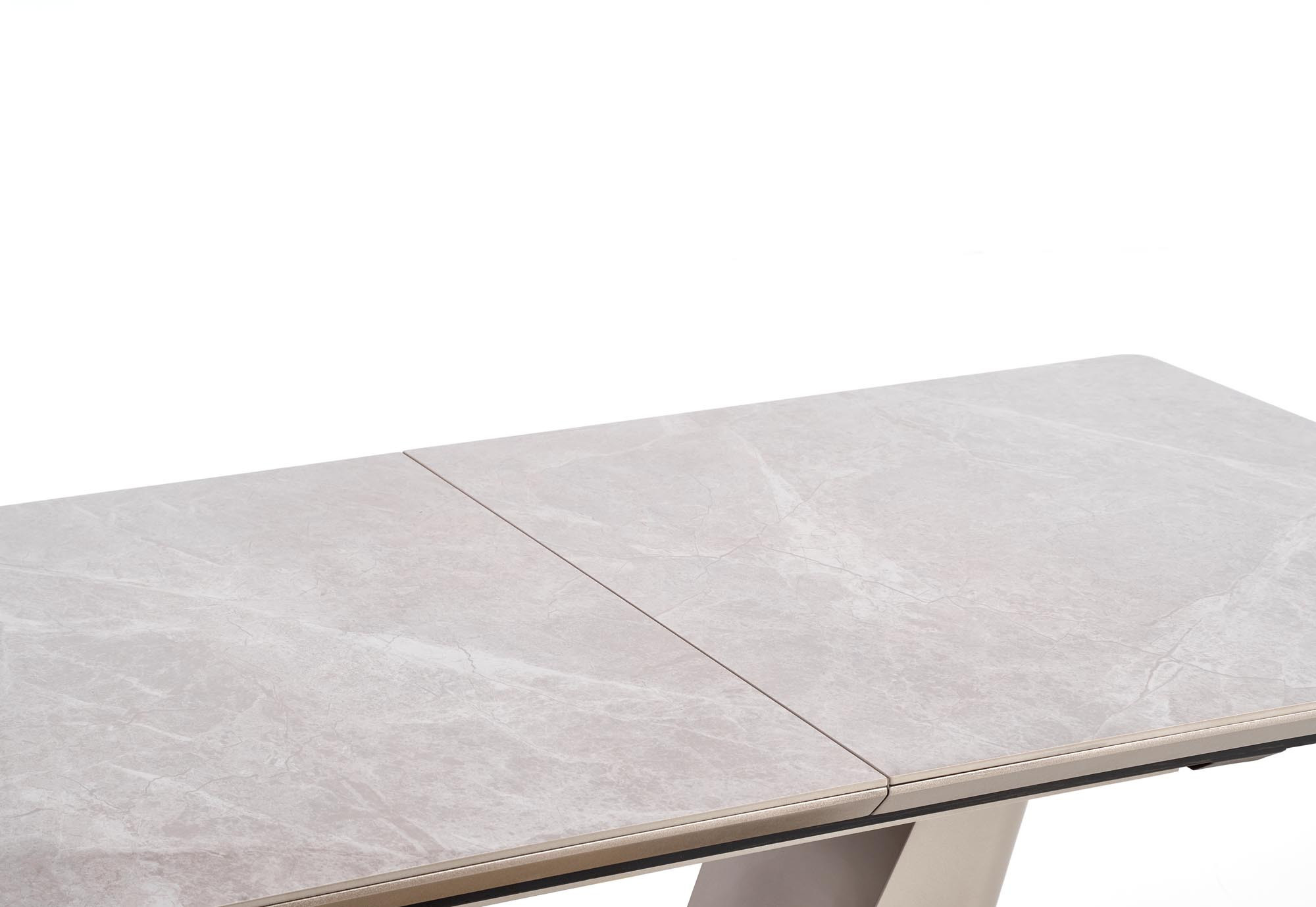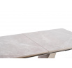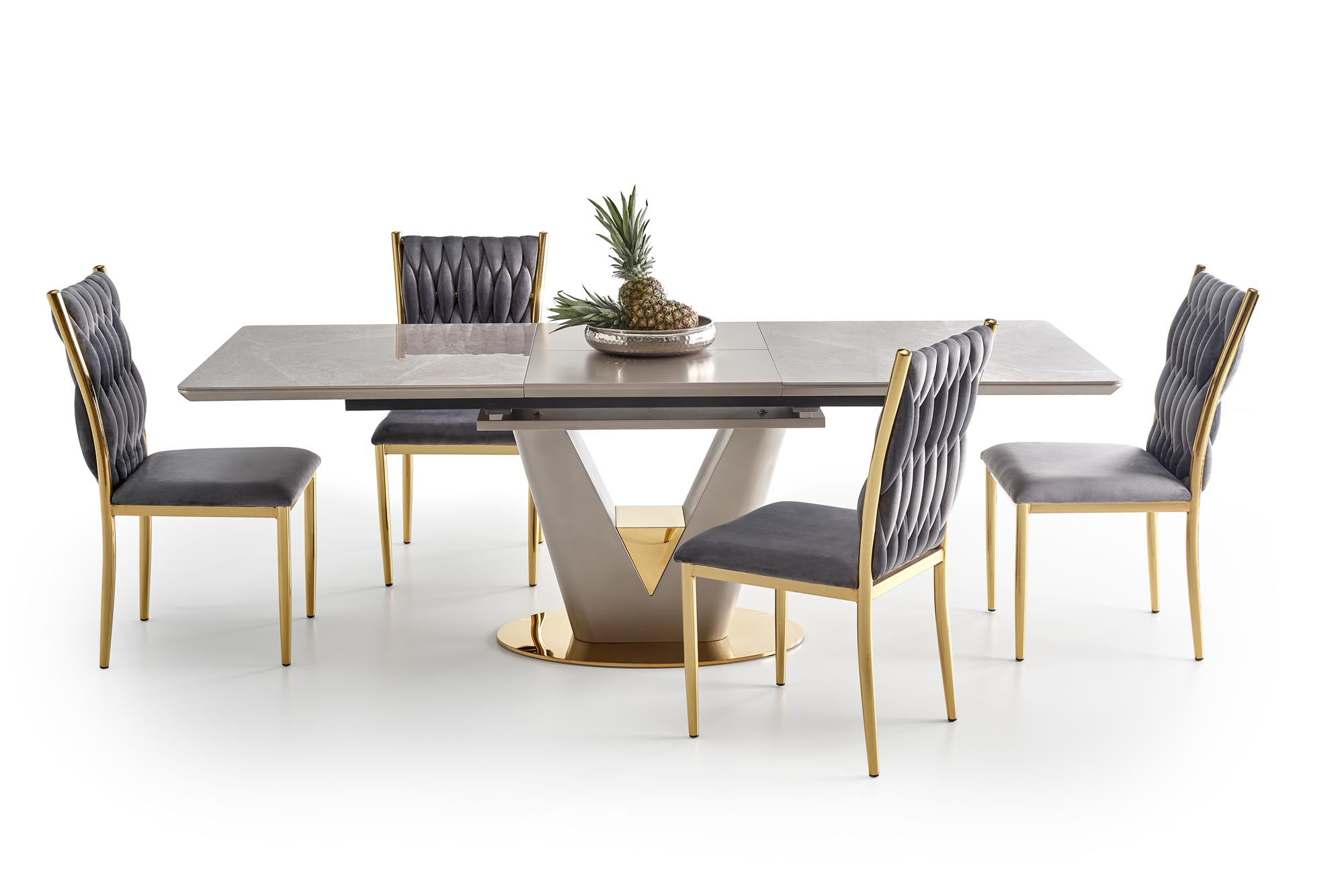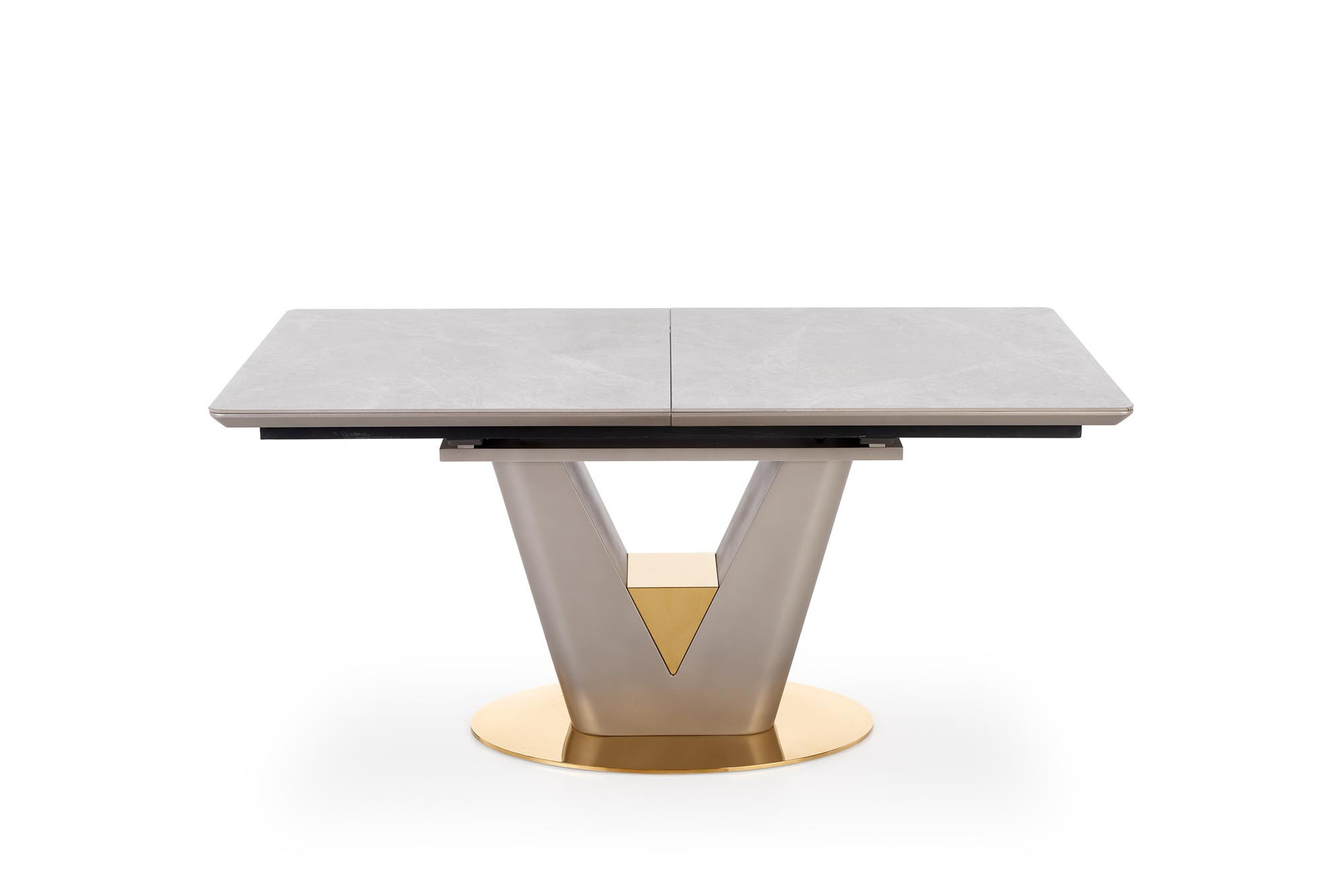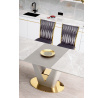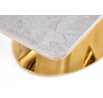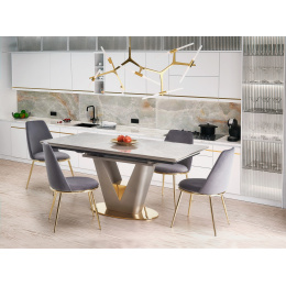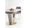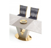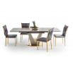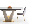 rozměry: 160-220/90/76 cm, rozkládací stůl, materiál: keramika / lakovaná MDF / chromovaná ocel, barva: deska - bílý mramor, noha - světle šedá / zlatá