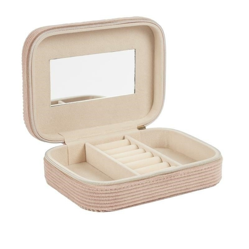 Manšestrová šperkovnice na zip je ideální organizér na šperky. Šperkovnice je vybavena přihrádkami na prsteny, náramky a náušnice. Šperkovnice má na vnitřní straně víka namontované malé zrcátko. Dostupná ve 3 barvách.