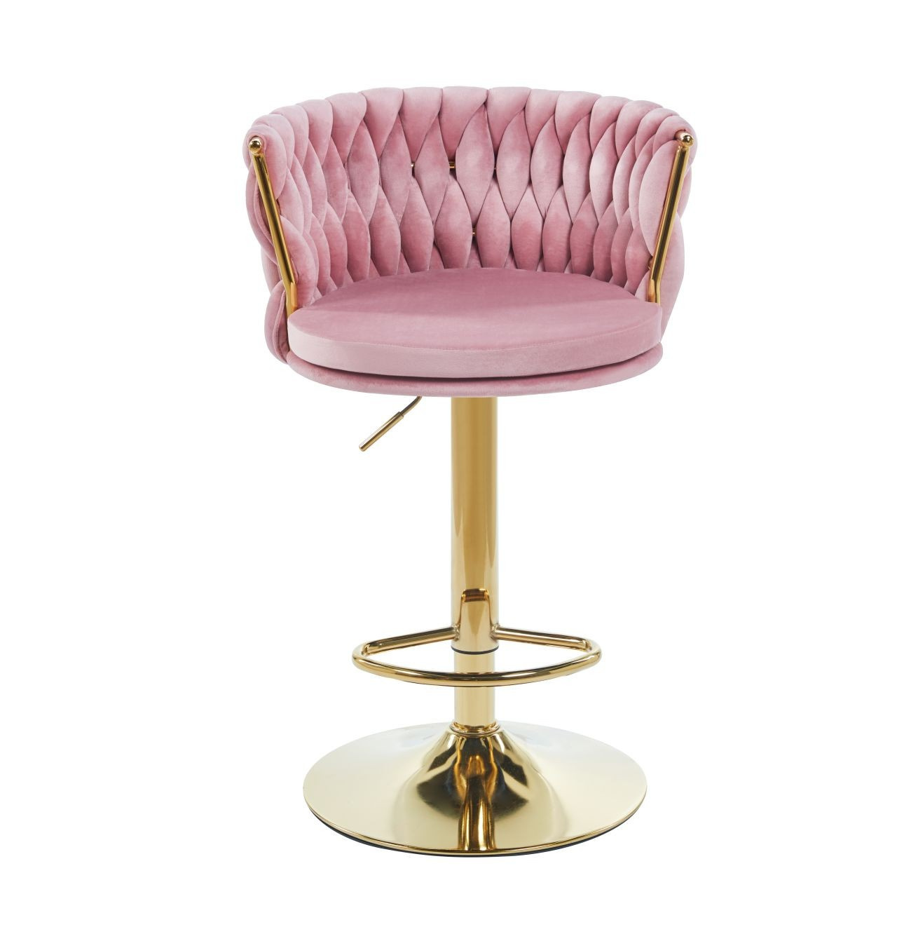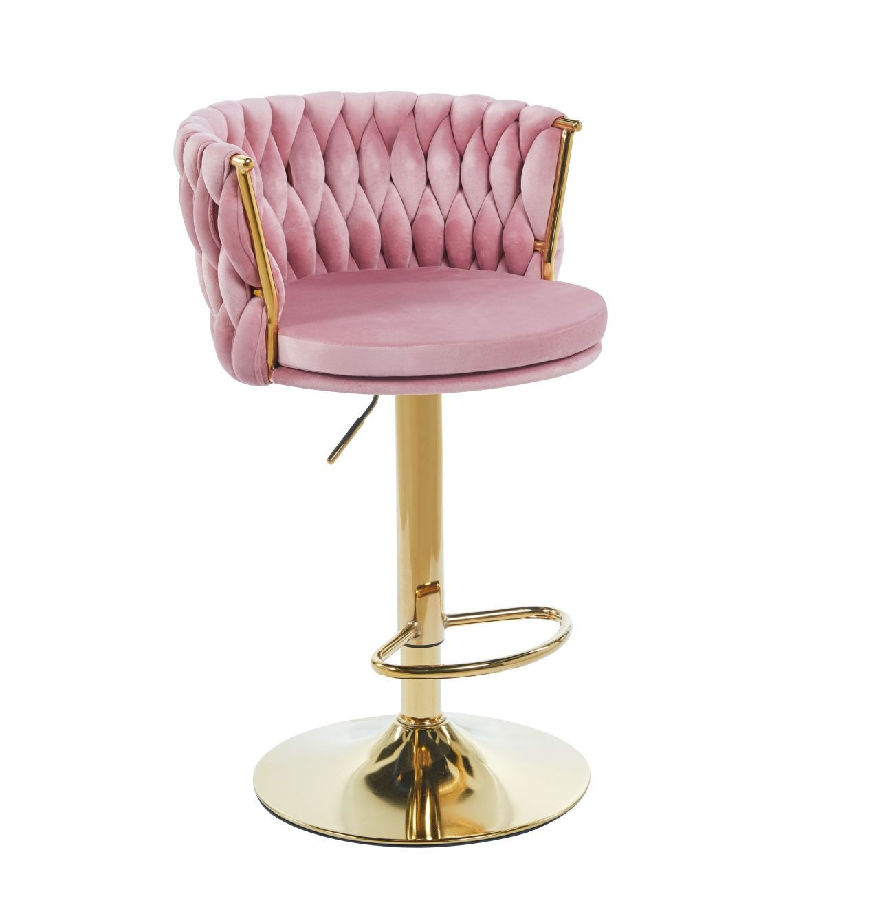 Rozměry: - výška sedáku: 60-80 cm - celková výška: 84-104 cm - výška opěradla: 25 cm - šířka sedáku: 44 cm - velikost sedáku pro sezení 40 cm - celková šířka: 53 cm - hloubka sedáku: 44 cm Materiál - čalounění: samet - konstrukce: chrom Barva: - sedák: růžový - konstrukce: zlatá
