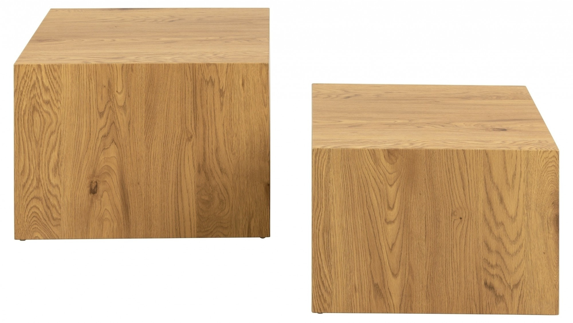 Sada dvou stolků ve tvaru krychlí (58x58x40;50x50x33). Jsou pokryty laminátem s dekorem dubu. Stolky budou skvěle vypadat v elegantním obývacím pokoji. Mohou také sloužit jako květinové záhony. Zespodu mají malé plastové nožičky, které chrání podlahu před poškozením. Počet kartonů: 1 Rozměry kartonů: 65x46x65cm Hmotnost kartonů: 23,5kg