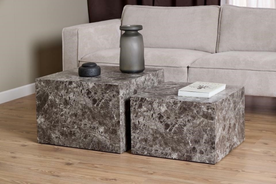 Sada 2 čtvercových konferenčních stolků Dice, deska a základna z MDF desky a dýhy připomínající hnědý mramor Carrara. Dovol, aby tato sada konferenčních stolků našla své místo ve tvém obývacím pokoji. Od čtvercového tvaru po mramorový vzhled - určitě na sebe upoutají pozornost. Použij je jako konferenční stolek nebo je umísti do rohu s velkou rostlinou nebo vázou, aby vynikla souprava. Rozměry velkého stolku: 58x58x40cm, rozměry malého stolku: 50x50x33cm.