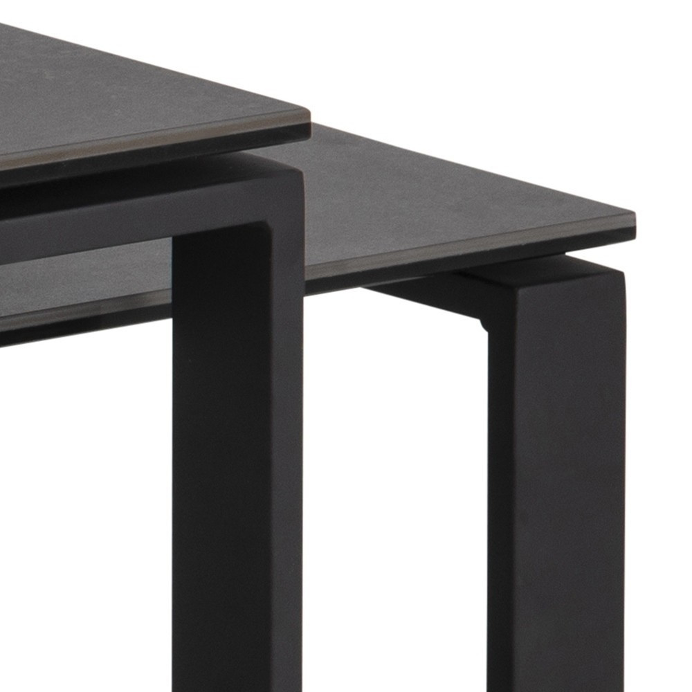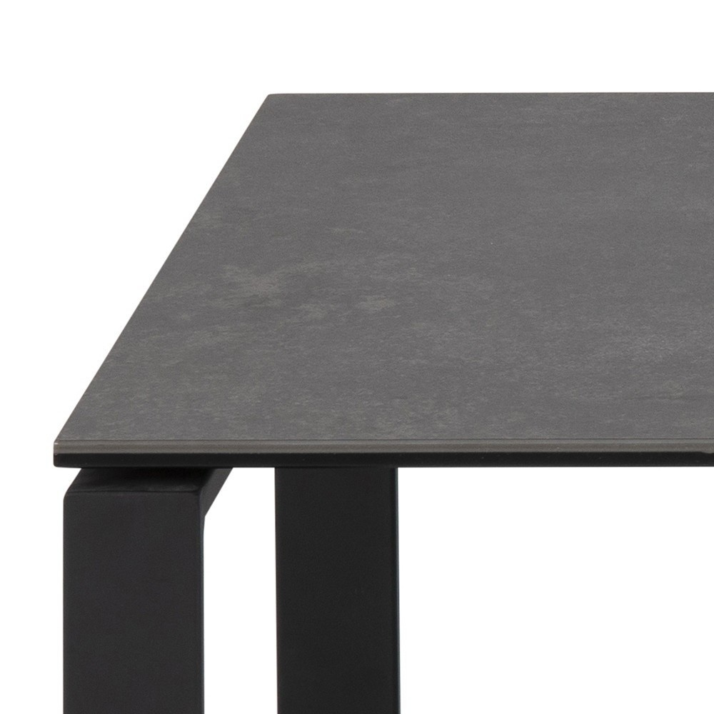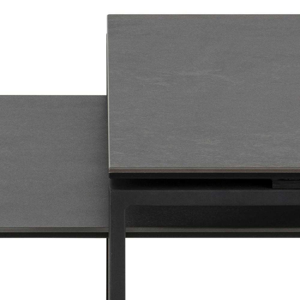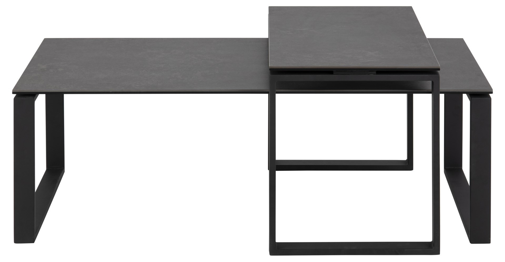 Moderní sada dvou stolků Katrine je kombinací vysokého stolku s nižším. Díky svým rozměrům můžeme stolky libovolně uspořádat, čímž vytvoříme zajímavý kus nábytku. Desky stolů jsou z tmavé hrubé keramiky Fairbanks. Základem stolků jsou nohy ve tvaru lyžin. Nohy byly vyrobeny z kovu lakovaného práškovou barvou na černo. Lak na použitý k natření základny je matný. Vzhledem k tomu, že deska stolu byla vyrobena z keramiky, je každá deska jiná a jedinečná. Rozměry stolků (cm): 115x55x37.5; 69x40x45 Hmotnost: 50,9 kg. Rozměry kartonů. První: 18cm x 127cm x 76cm. Druhý: 11cm x 107,5cm x 62cm