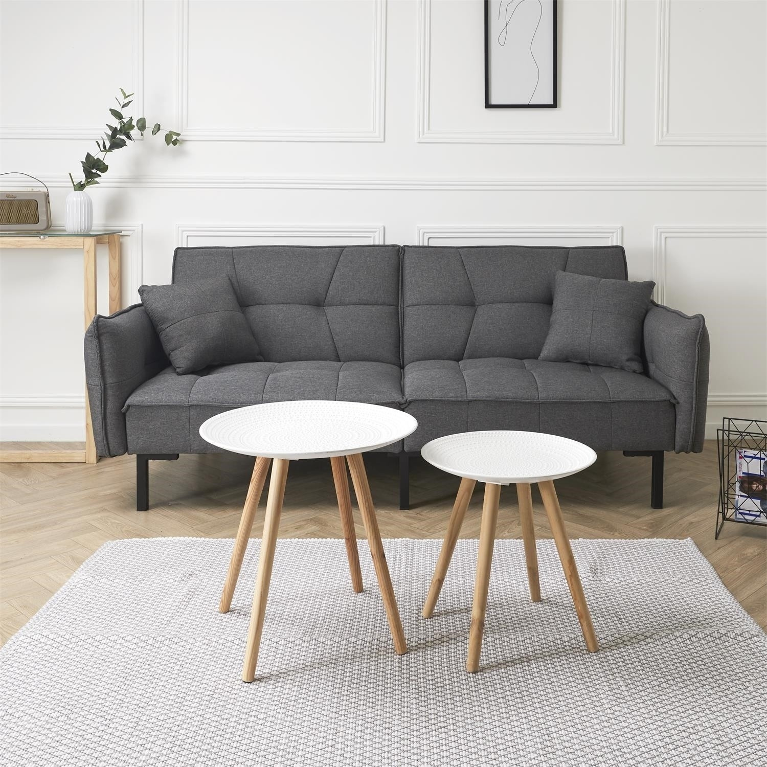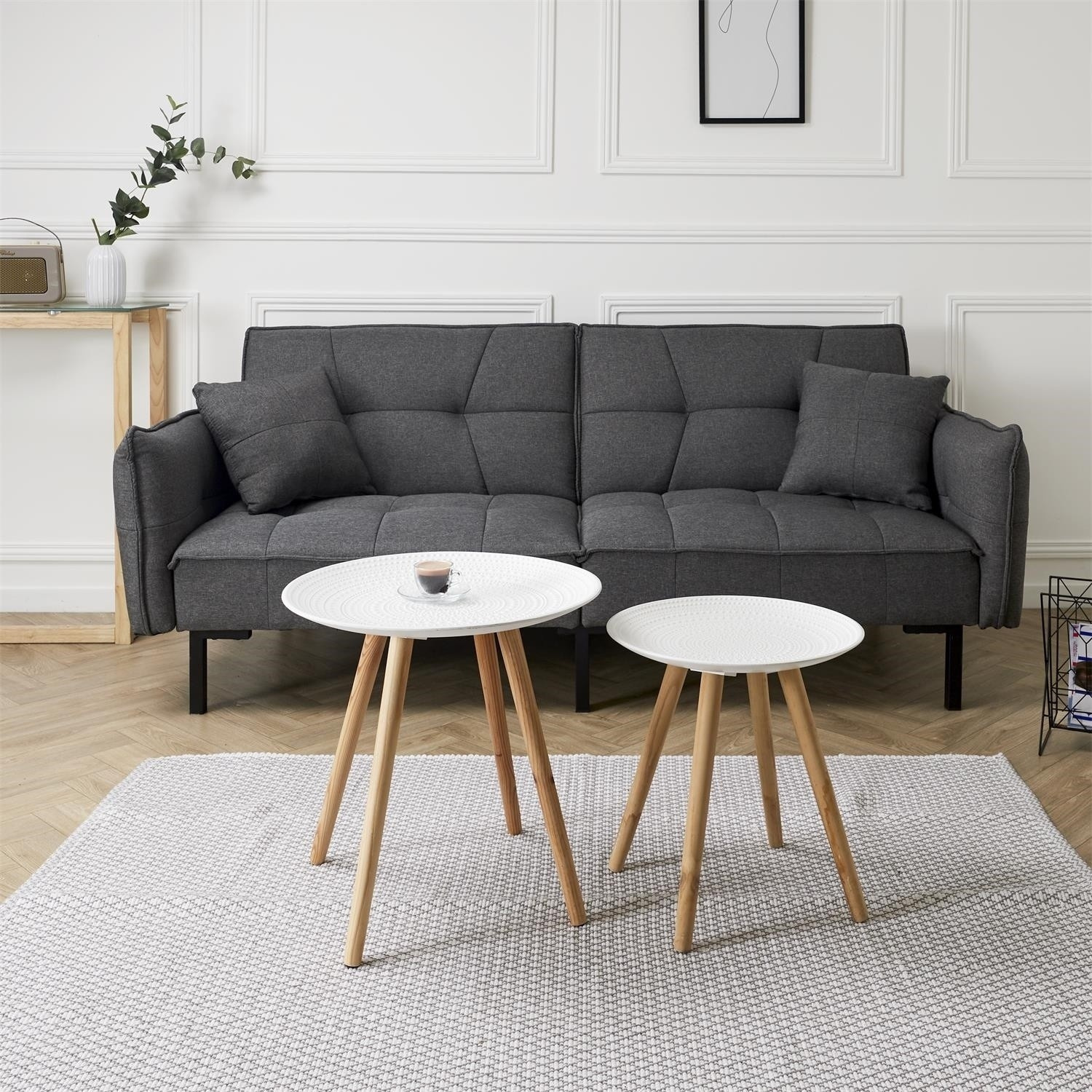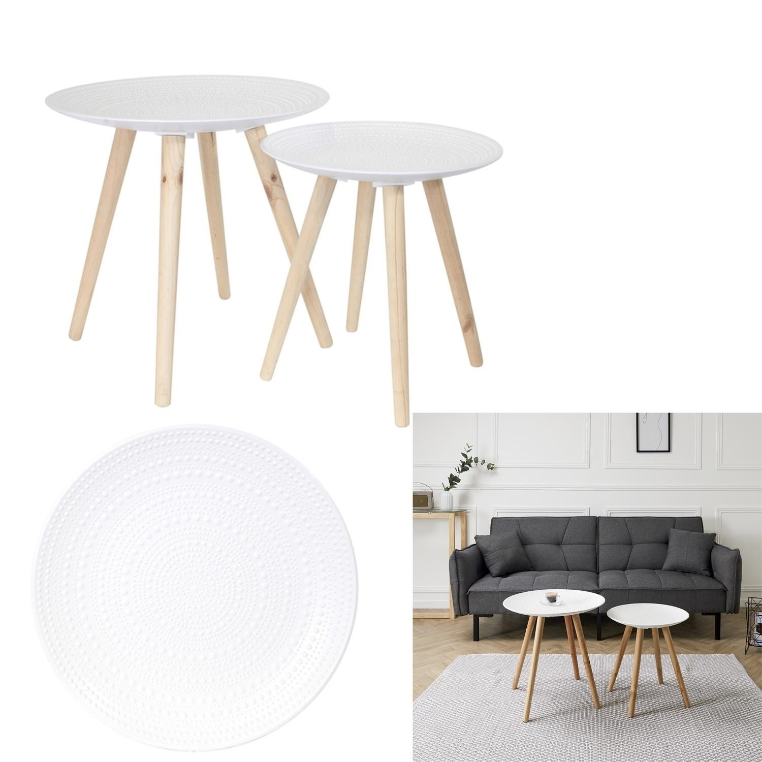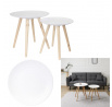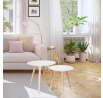 Sada dvou kulatých stolků umožní uspořádání obývacího pokoje nebo předsíně ve skandinávském stylu. Dva stolky o dvou velikostech: velký vysoký: 49,5 cm o průměru 49,5 cm a malý o výšce 42,5 cm a průměru 39,5 cm.Tato sada stolků bude vypadat skvěle ve vašem obývacím pokoji nebo kanceláři! 100% skandinávský design dodá vašemu interiéru špetku elegance! Kulaté desky z MDF a nohy jsou vyrobeny z surového dřeva. Vyžadují snadnou montáž. Max. zatížení 10 kg na stolek.