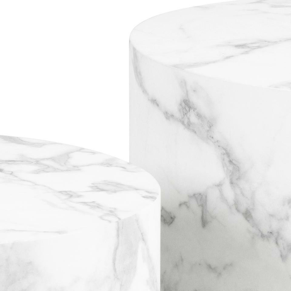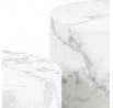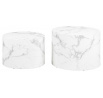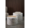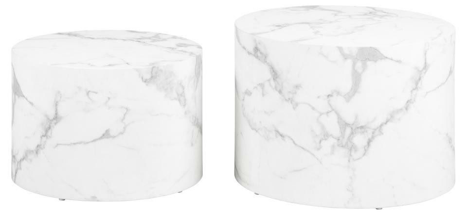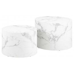 Sada 2 kulatých konferenčních stolků Dice vyrobených z MDF desky s dýhou imitující přírodní kámen. Umístěné před pohovkou nebo z boku, tyto kulaté konferenční stolky dodají elegantní vzhled vašemu obytnému prostoru. Ať už stojí spolu, nebo samostatně, vytvářejí vizuálně zajímavý bod, který přitahuje pozornost. Jejich aerodynamický tvar a dýha imitující přírodní kámen přinášejí moderní a neobyčejně elegantní vzhled, díky čemuž se hodí do každého stylu interiéru. Rozměry stolků: větší: průměr 58 cm, výška 40 cm a menší: průměr 50 cm, výška 33 cm