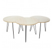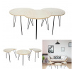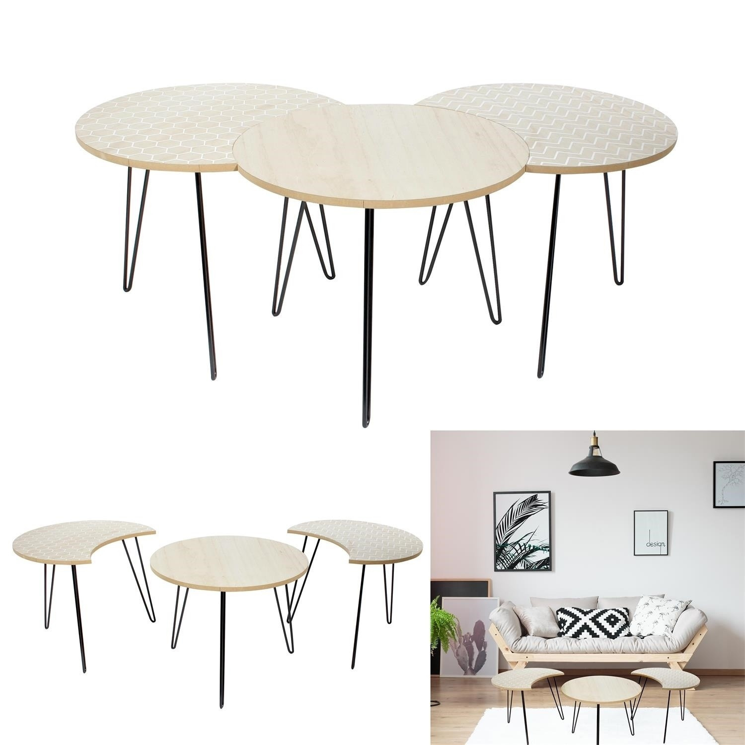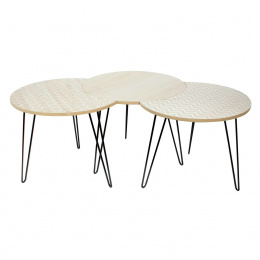 Sada 3 konferenčních stolků je ideální kombinací designu a funkčnosti. Stolky můžeme libovolně kombinovat a různé vzory na jejich deskách se budou doplňovat. Přizpůsob je svým potřebám a sestav jeden modul nebo dva, a pak tři. Celý kus je vyroben z krásně zdobené desky z MDF, která stojí na kovových nohách, elegantní a módní kombinace! Max. zatížení na jeden stolek 10 kg Rozměry stolků: kulatý výška 36 cm, průměr 45 cm, Boční stolky: výška 36 cm, šířka 45 cm, hloubka 38 cm.