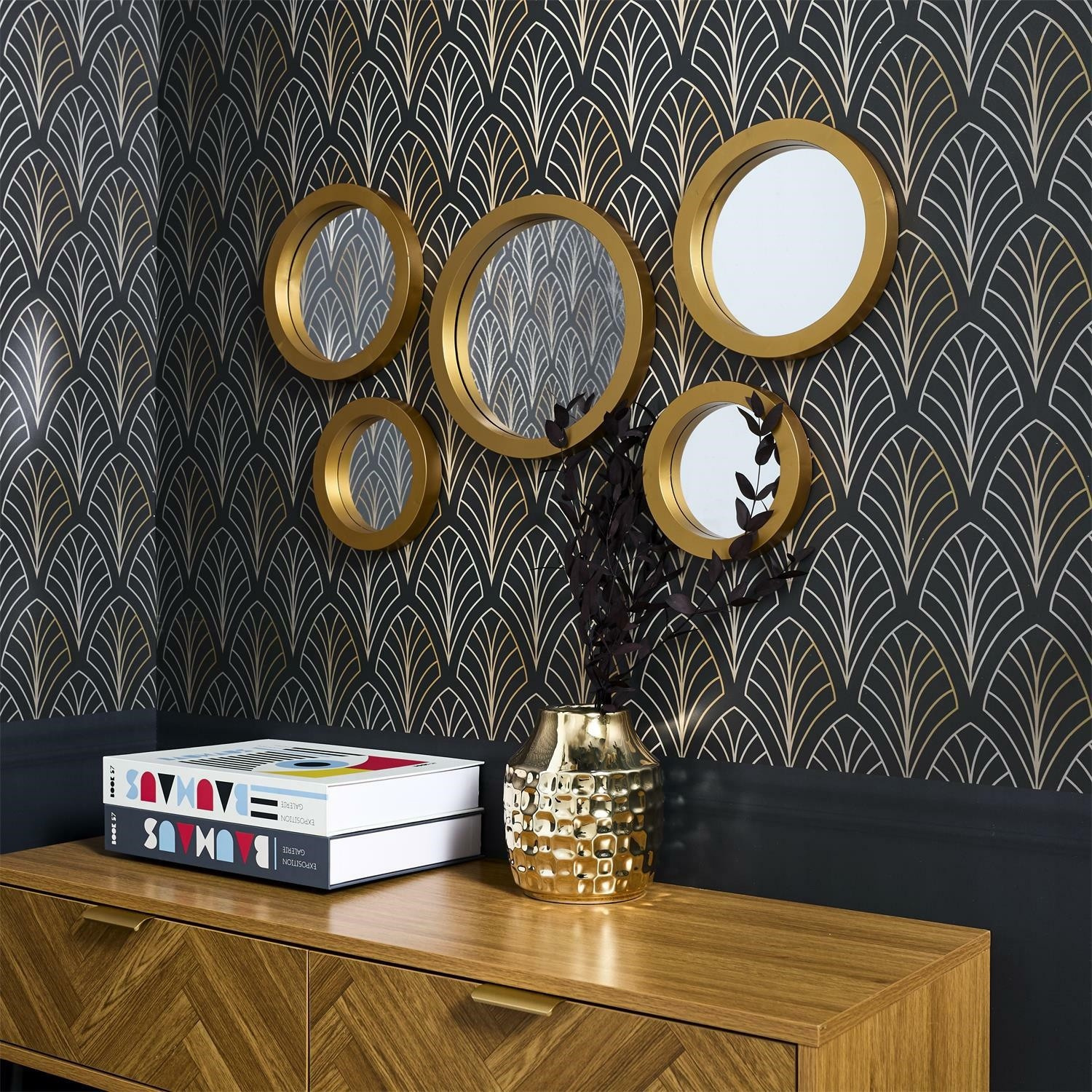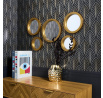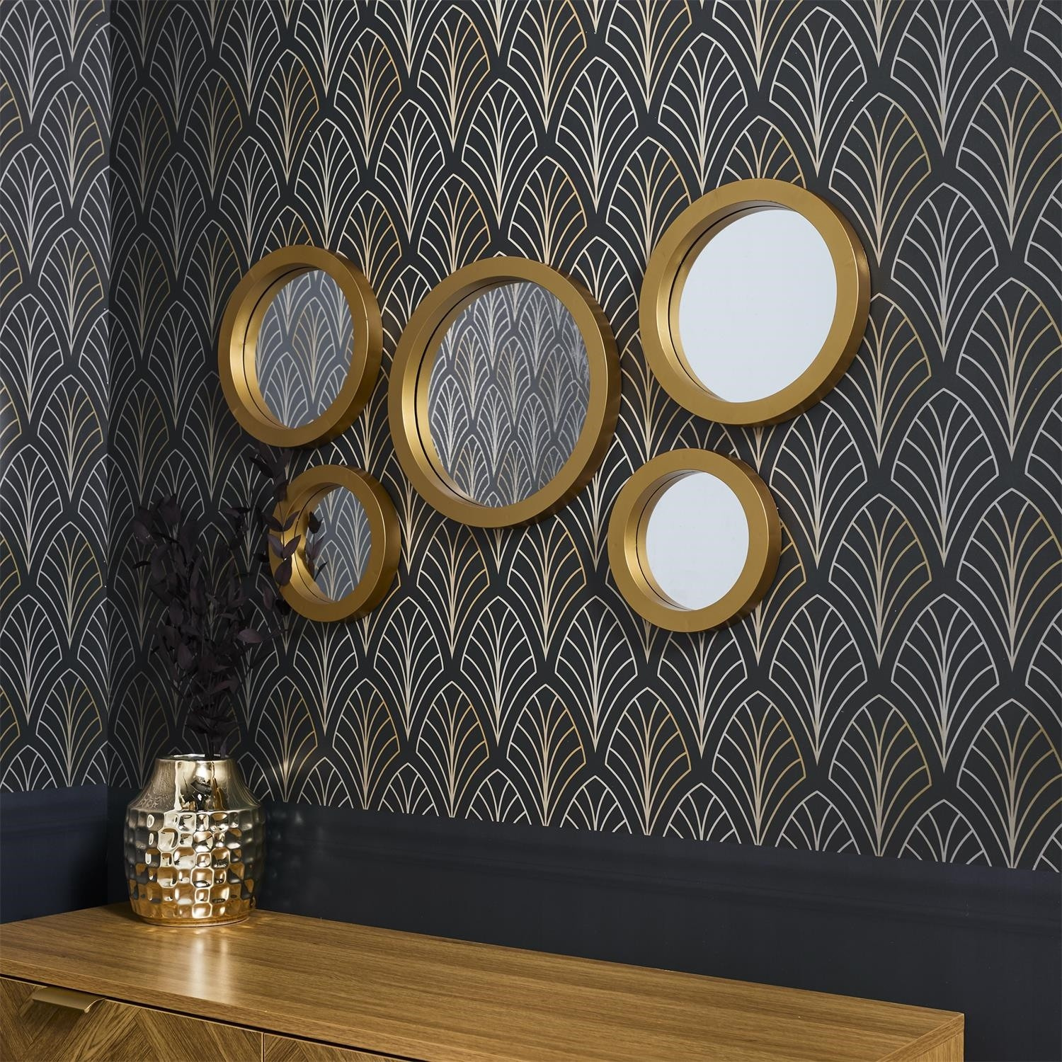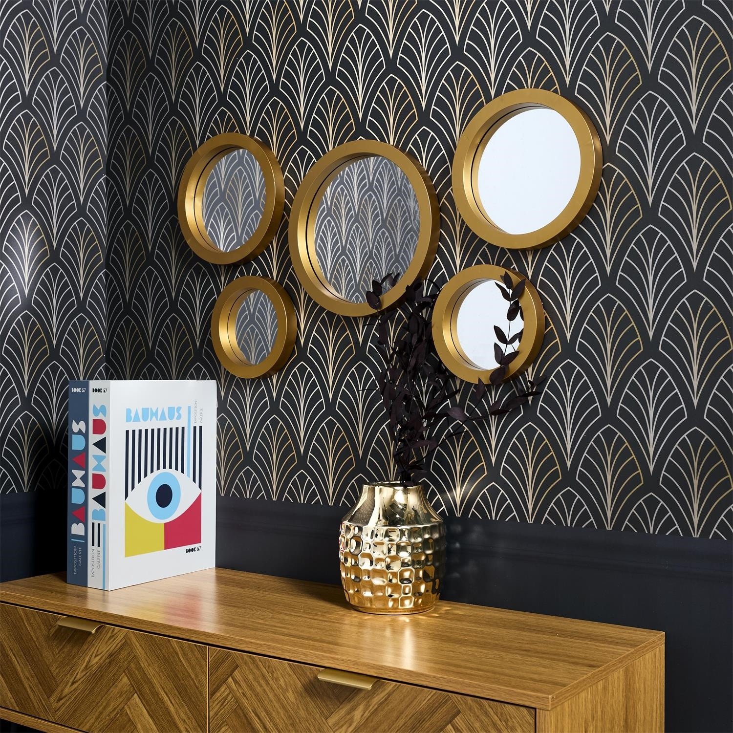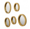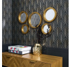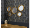 Sada 5 zrcadel s organickými tvary. Vyrobené z plastu rámečky ve zlaté barvě dodávají moderní a nadčasový vzhled. Deska zrcadla vyrobená ze skla. Zadní strana zrcadel je vybavena univerzálním úchytem, který umožňuje zavěsit zrcadla vertikálně i horizontálně.