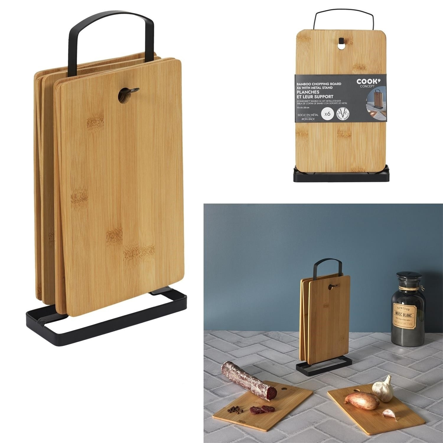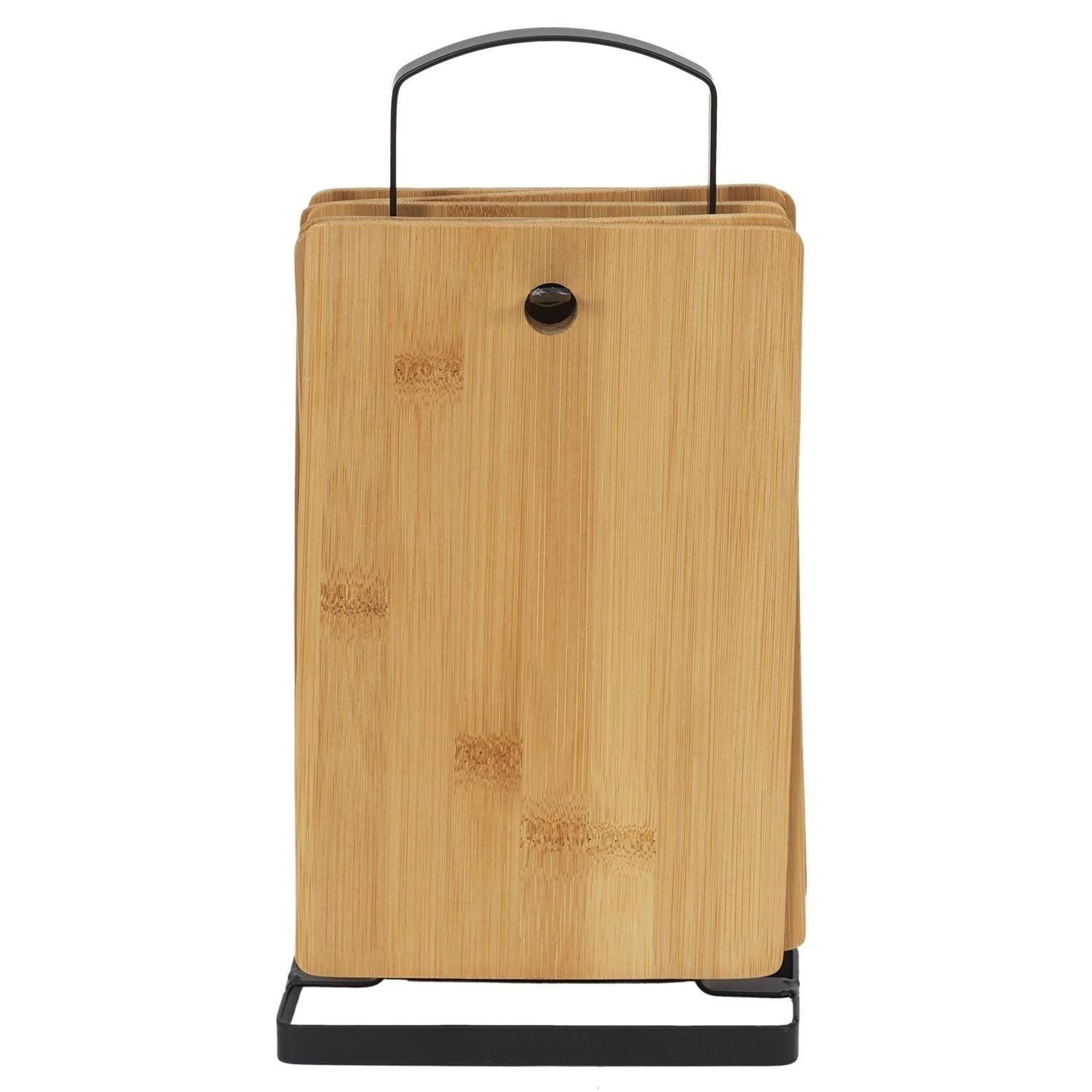 Sada 6 bambusových prkének na krájení a servírování pokrmů se osvědčí v domě, kde je pohodlí při vaření důležitým faktorem. Desky na kovovém stojanu jsou uspořádané a vždy po ruce. Rozměry jedné desky: 22x15x1 cm. Nelze mýt v myčce, nelze používat v troubě, mikrovlnné troubě ani v troubě.