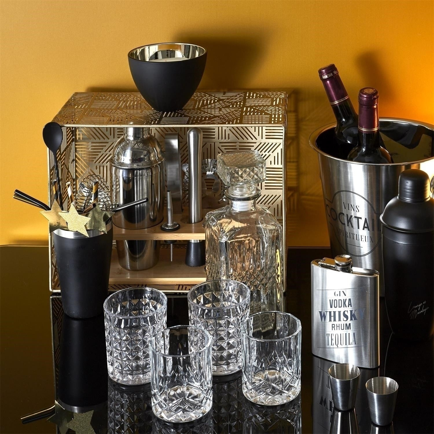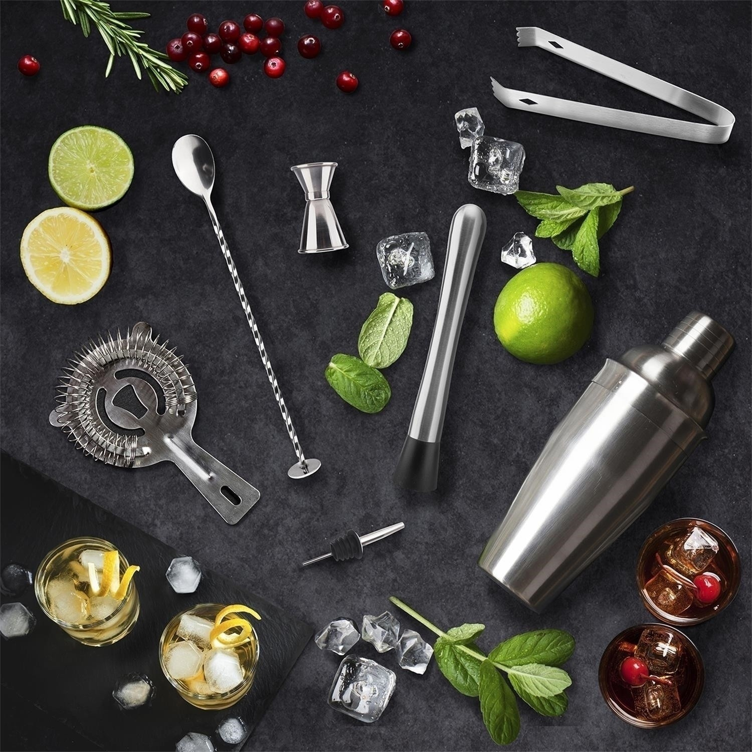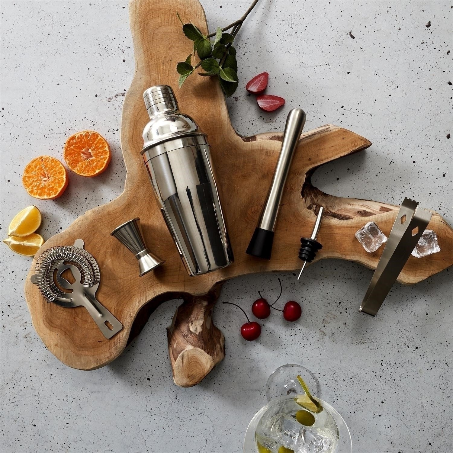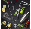 Tato elegantní sada na koktejly je skvělou volbou pro milovníky domácího barmanství. Součástí sady je sedm nezbytných nástrojů pro přípravu drinků: shaker, odměrka, muddler (mačkadlo), kleště na led, barmanské sítko, barová lžíce a elegantní dřevěný stojan, který umožňuje stylové uložení příslušenství. Všechny prvky jsou vyrobeny z vysoce kvalitní nerezové oceli, což zaručuje jejich trvanlivost a profesionální vzhled. Stojan z přírodního dřeva dodává celku eleganci a umožňuje pohodlně uspořádat pracovní místo. Sada je ideální jak pro začátečníky, tak pro zkušené barmany, představuje nejen funkční nástroj, ale také estetický doplněk do každé kuchyně nebo domácího baru. Délka 27,8 Výška 24,5 Hloubka 10,8 Materiál: Nerezová ocel, bambus, silikon