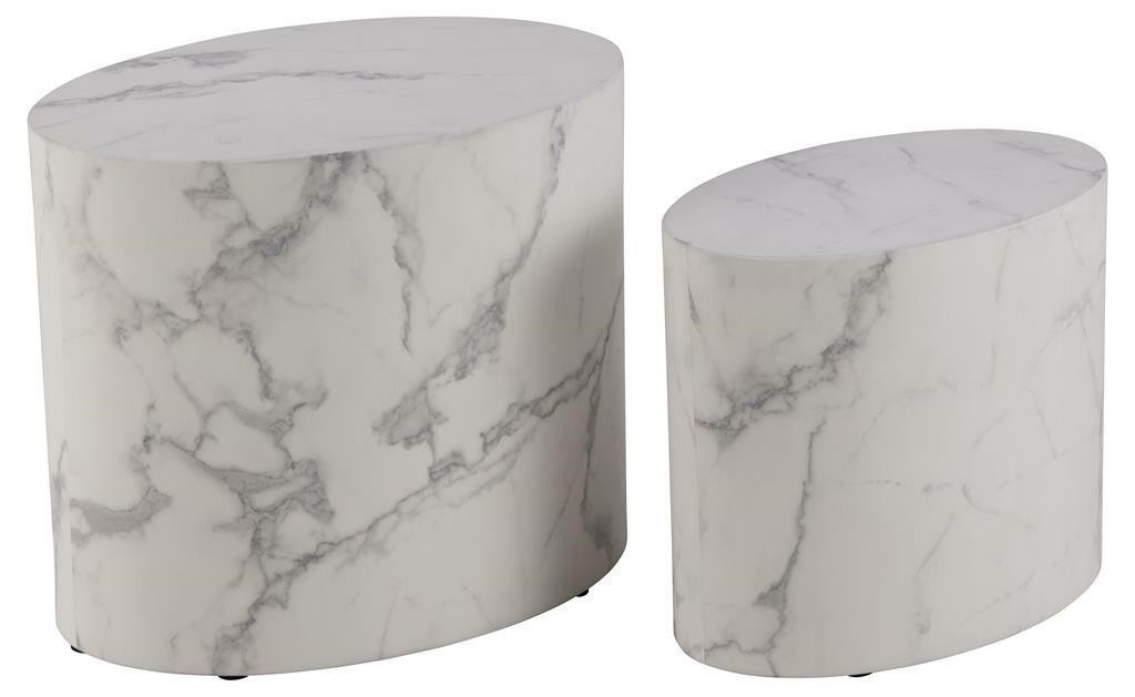 Tato sada konferenčních stolků se vyznačuje neobvyklým a zároveň moderním designem. Odráží krásu přírodního kamene, tento projekt je pokryt dýhou s vzhledem bílého mramoru. Oválný tvar stolku dodává interiéru rafinovaný charakter. Aby ušetřit místo nebo vytvořit jinou aranžaci, lze umístit menší stolek uvnitř většího. Hlavní vlastnosti: Sada 2 stolků s mnoha možnostmi stylizace Univerzální konferenční stolek šetřící místo Moderní oválný tvar Vzhled bílého mramoru Snadná údržba Rozměry stolků: 48x33x40; 40x24,5x33 Počet kartonů: 1 Rozměry kartonů: 51x44x37 cm Hmotnost kartonů: 9,5 kg