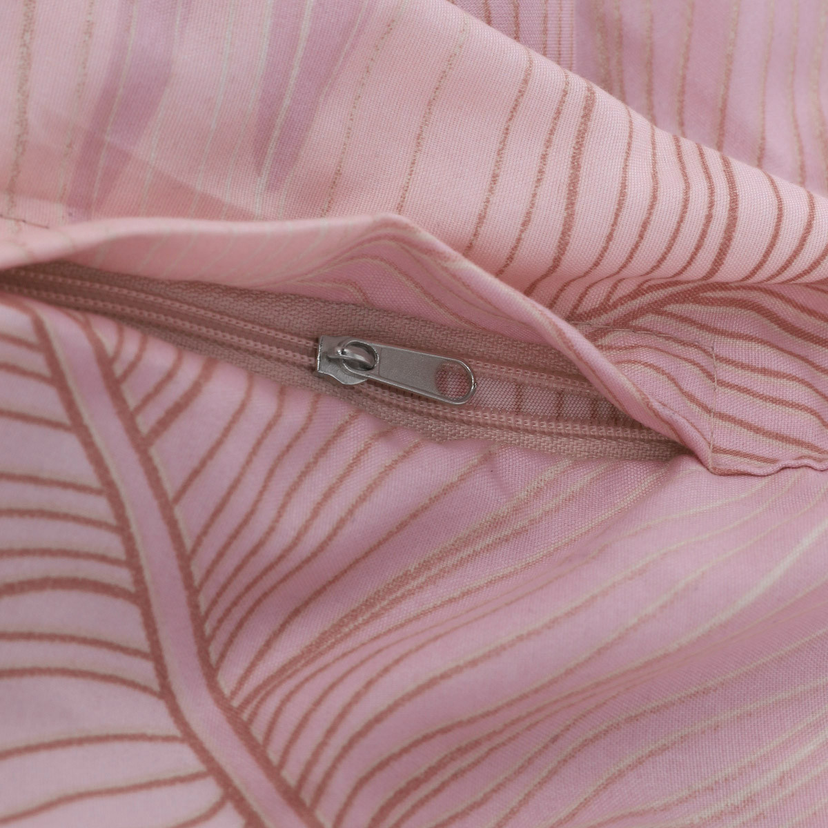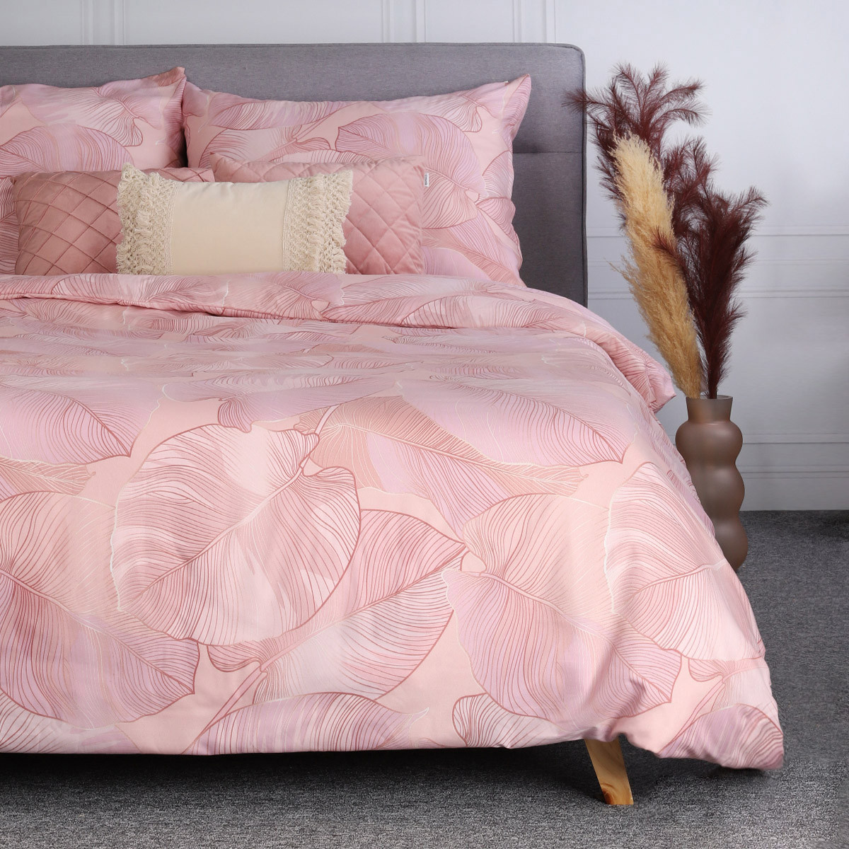 Souprava GALLO je laděna v různých odstínech růžové. Dynamický tisk představuje velké listy obrysované konturami v barvě klasického zlata. Součástí sady je povlak na přikrývku o rozměrech 200x220 cm a dva povlaky na polštáře o rozměrech 70x80 cm. Pro větší pohodlí při používání jsou uzavíratelné na zip.