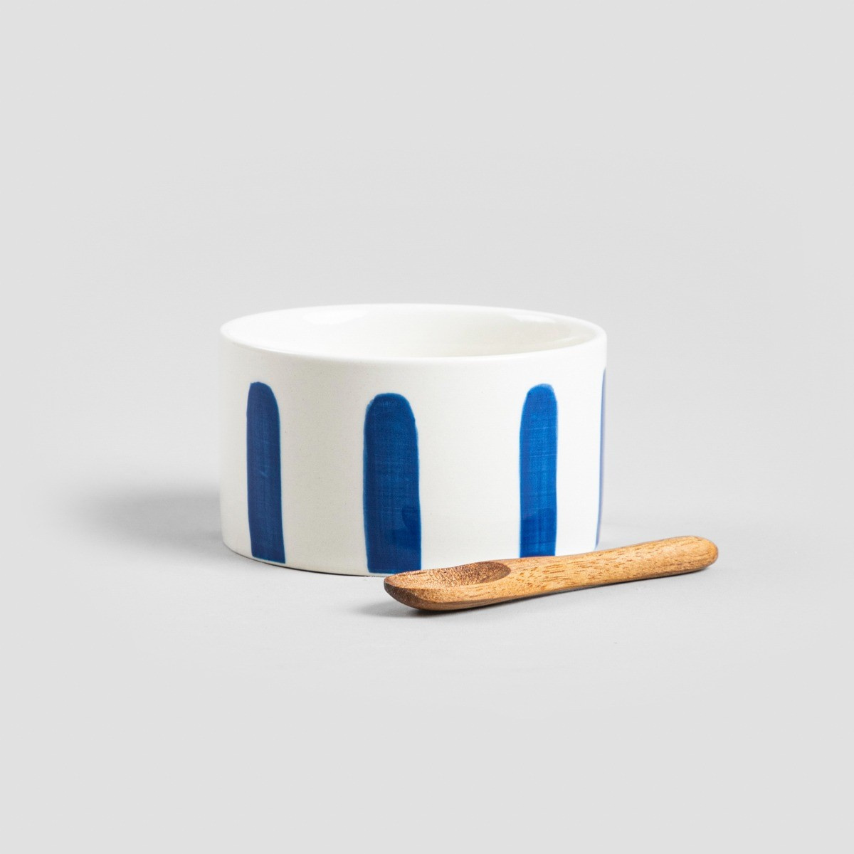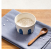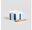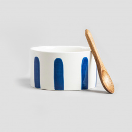 Miska je vyrobena z vysoce kvalitní keramiky, zdobená modrými akcenty. Lžíce je vyrobena z přírodního dřeva.