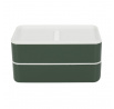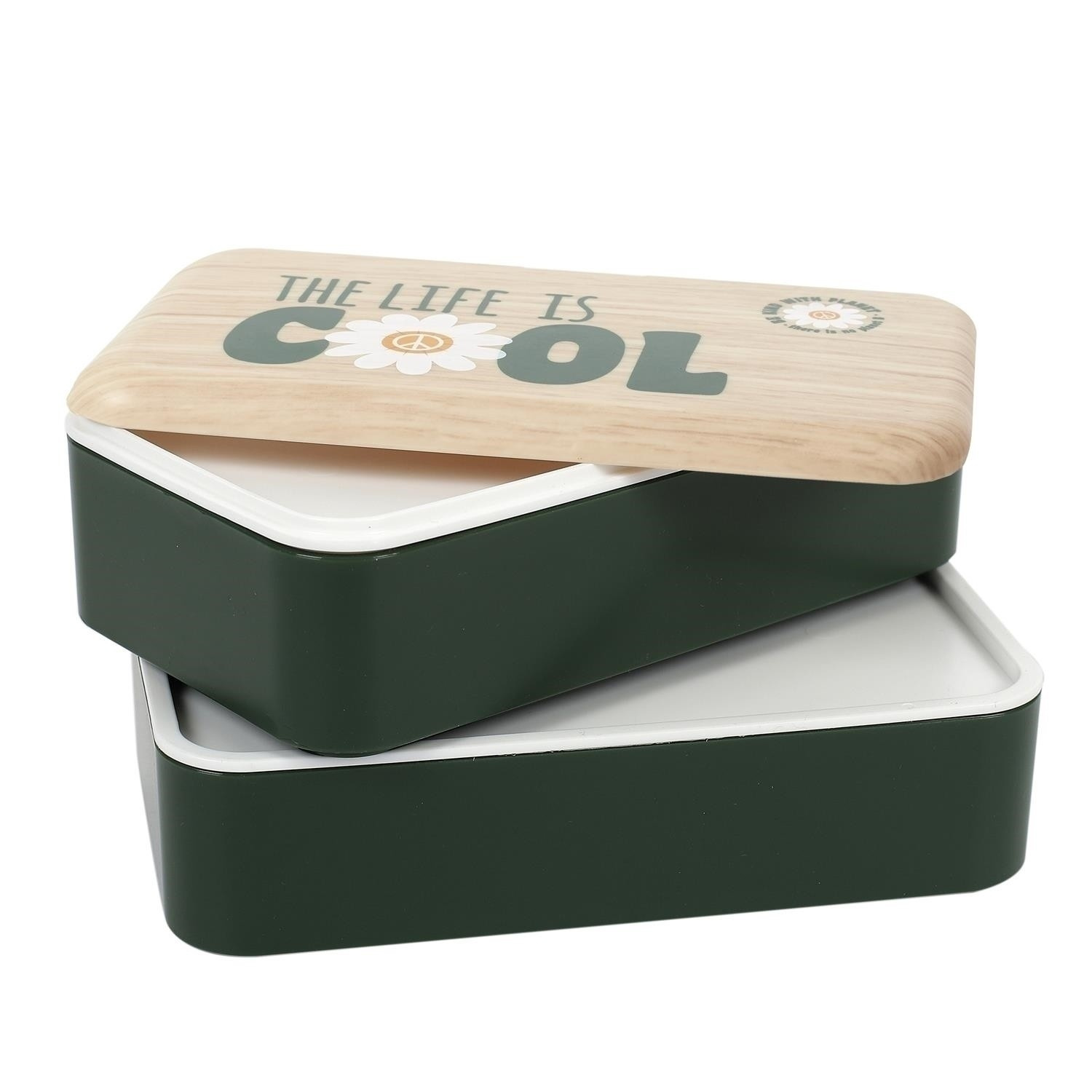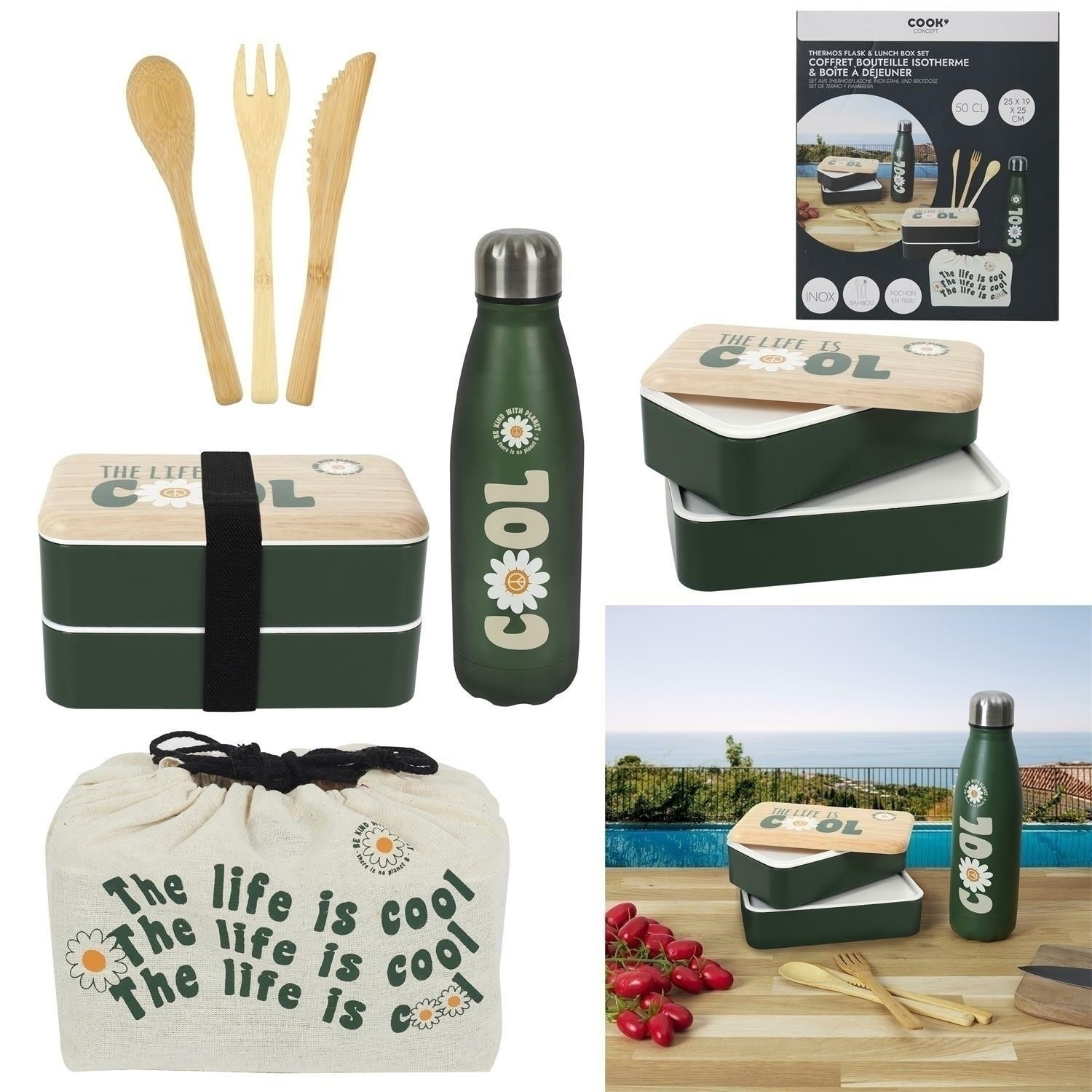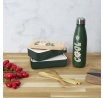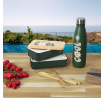 Sada na oběd, která odráží vaši touhu po stylovém a ekologickém způsobu stravování na cestách. Součástí sady jsou dřevěné příbory, které dodávají přirozený půvab, kovová láhev v zelené barvě, zaručující čerstvost nápojů, lunch box se dvěma úrovněmi a dřevěným víkem, umožňující oddělení různých pokrmů, a taška se stahovací šňůrkou, zajišťující praktické skladování. To je skvělé řešení pro ty, kteří si cení zdravého a vyváženého stravování na cestách. Připrav si svá oblíbená jídla, zabezpeč je v této stylové sadě a užívej si chutné jídlo kdykoliv a kdekoliv.