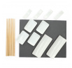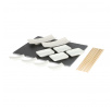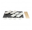 Součástí setu na sushi STONE je velká kamenná deska o rozměrech 30x24cm, čtyři malé bílé obdélníkové mističky na sójovou omáčku, čtyři páry bambusových hůlek s bílými porcelánovými podložkami a dva zakřivené talířky na přílohy.