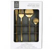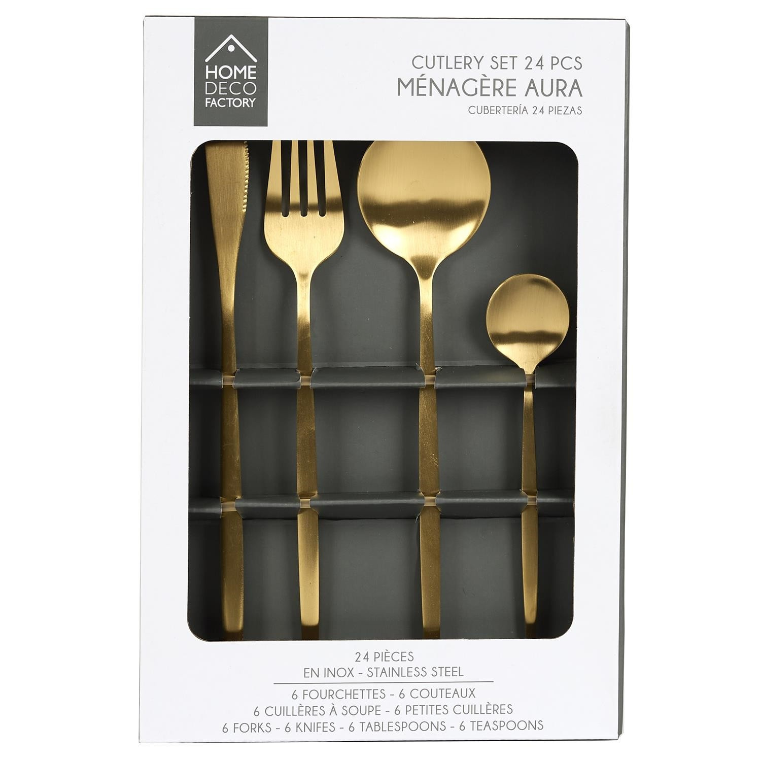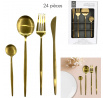 Sada zlatých příborů Gilded dodá eleganci během svátků nebo rodinných oslav. Příbory ideální na přijímání, výroční oběd nebo narozeniny. Příbory vyrobené z nerezové oceli. Sada obsahuje 6 malých lžiček, 6 velkých lžic, 6 vidliček a 6 nožů. Nelze používat v mikrovlnné troubě, Lze mýt v myčce nádobí Nelze používat v troubě Nelze používat v mrazáku