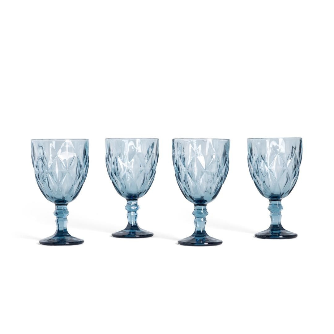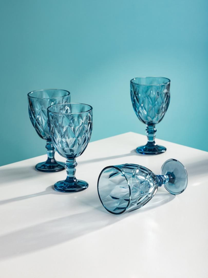Sada obsahuje čtyři sklenice o objemu 340 ml, ideální pro podávání červeného a bílého vína. Mají klasickou formu, ale vyznačují se svým jedinečným designem a barvou. Modrý odstín brýlí je velmi originální akcent, který se dokonale hodí k glamour nebo moderním aranžmá. Sada je ideální jak pro každodenní jídla, tak pro zvláštní příležitosti.