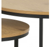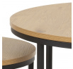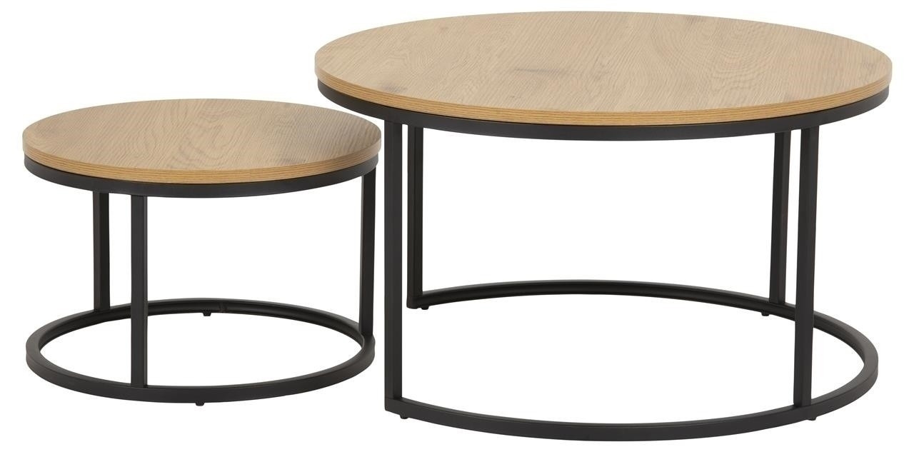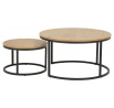 Moderní sada dvou kulatých konferenčních stolků, jejichž nespornou výhodou je možnost schovat menší pod větší. Kulaté desky stolků byly vyrobeny z laminované MDF desky. Laminát s vzorem a barvou přírodního dubu zajímavě ladí s černou kovovou základnou stolků. Kulaté stolky mají odolnou a stabilní základnu vyrobenou z kovu s práškovým nástřikem. Sada stolků Spiro je ideálními konferenčními stolky do obývacího pokoje nebo čekárny. Stolky v moderním stylu se hodí do každého interiéru a budou jeho ozdobou. Hmotnost stolků: 15 kg Rozměry kartonu: 86 x 17,2 x 77,5 cm