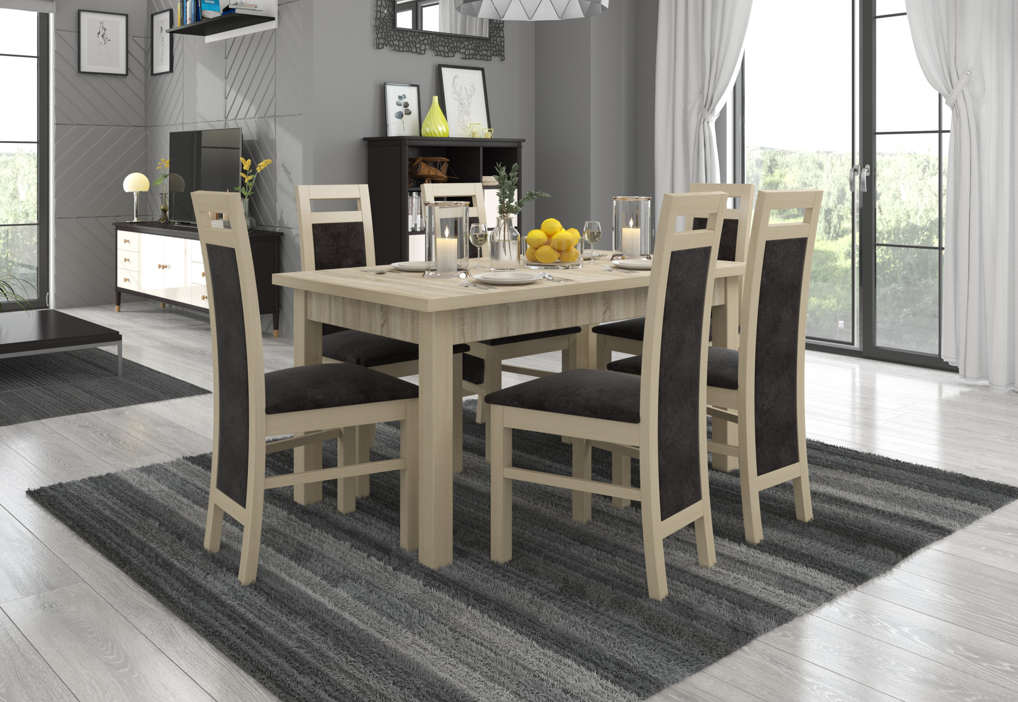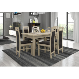 Sestava RODOS 14 je ideálním řešením pro klasickou jídelnu. Součástí sady je pevný stůl a šest pohodlných židlí. Stůl s jednoduchým designem umožní pohodlně usadit 6 osob. Nábytek je velmi elegantní a pohodlný. Vyber barvu a kolekci látky a navrhni si svou vysněnou sadu.