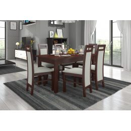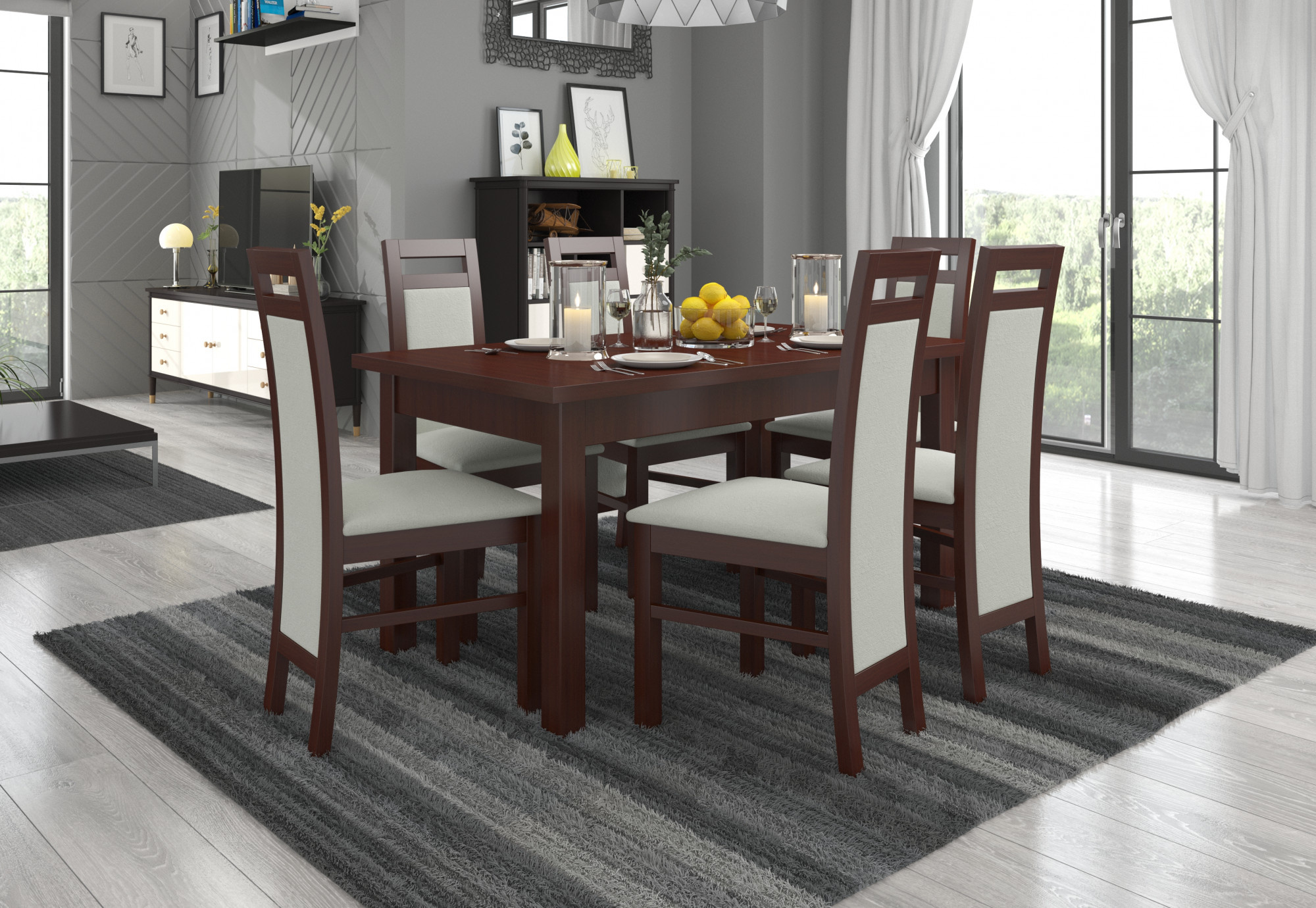 Sestava RODOS 14 je ideálním řešením pro klasickou jídelnu. Součástí sady je pevný stůl a šest pohodlných židlí. Stůl s jednoduchým designem umožní pohodlně usadit 6 osob. Nábytek je velmi elegantní a pohodlný. Vyber barvu a kolekci látky a navrhni si svou vysněnou sadu.