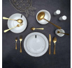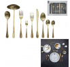 Kovová sada příborů ve starozlaté barvě je vintage nádobí, které ozdobí náš sváteční stůl. Sada obsahuje: Vidličky: 6 ks, Lžíce: 6 ks, Nože: 6 ks, Malé lžičky: 6 ks, Vidličky na dort: 6 ks, Lžičky na kávu: 6 ks, Vidlička na maso, naběračka a lžíce na omáčku. Sada je vyrobena z nerezové oceli, takže ji lze mýt v myčce.