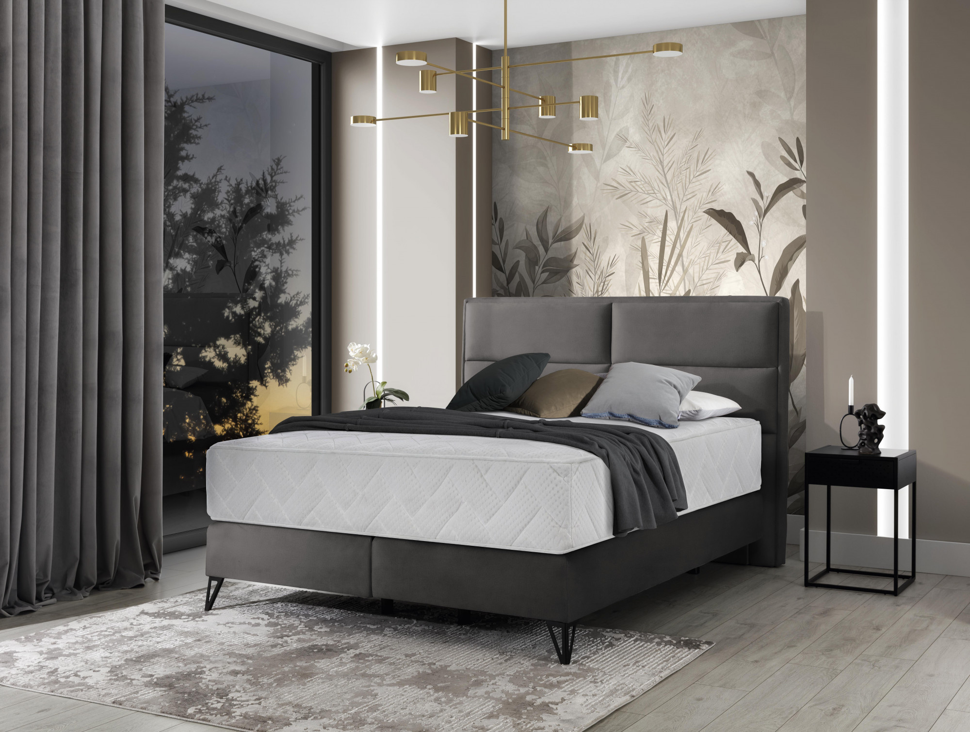 Kontinentální postel Safiro je dodávána s vysoce kvalitní matrací, která je nejen velmi pohodlná, ale také praktická. Vděčí za to snímatelnému potahu na zip a oboustrannosti matrace. Matrace se skládá z vrstev kombinujících latex, pěnu T25, kokos a visco pěnu. Uvnitř matrace je také kapsová pružina. Nápadným prvkem postele Safiro jsou bezesporu její designové černé nohy vyrobené z kovu. Kromě své dekorativní funkce také udržují postel stabilní a umožňují pohyb čisticích robotů pod nábytkem. Dalším dekorativním prvkem je opěrka hlavy a prošívání, které rozděluje zadní část nábytku na 4 menší obdélníky. Navíc lze boxspring Safiro vybrat ze 3 typů spací plochy: 140x200 cm, 160x200 cm, 180x200 cm.