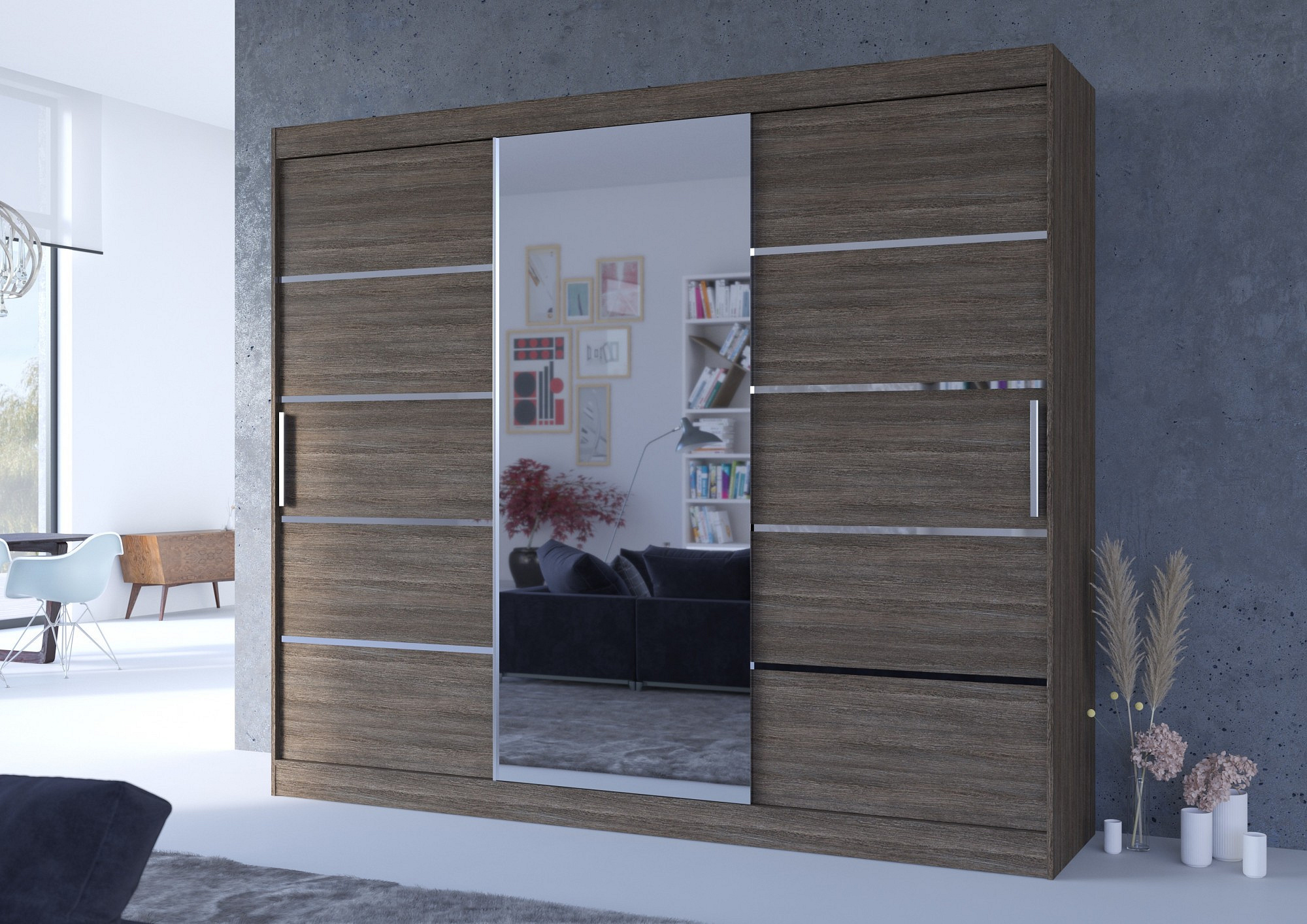 Posuvná skříň SALTO je ideálním způsobem, jak uspořádat prostor. Nábytek je vybaven prostornými policemi a tyčí, na kterou můžete pověsit šaty, obleky, svrchní oděvy nebo košile. Na čelní straně se nachází zrcadlo a charakteristické vodorovné pruhy ve stříbrné barvě, které nábytku dodávají výjimečný styl. Díky tomu, že skříň je posuvná, nemusíte vyčleňovat další místo na otevření dveří, což z ní činí ideální řešení pro malý pokoj nebo úzkou předsíň.
