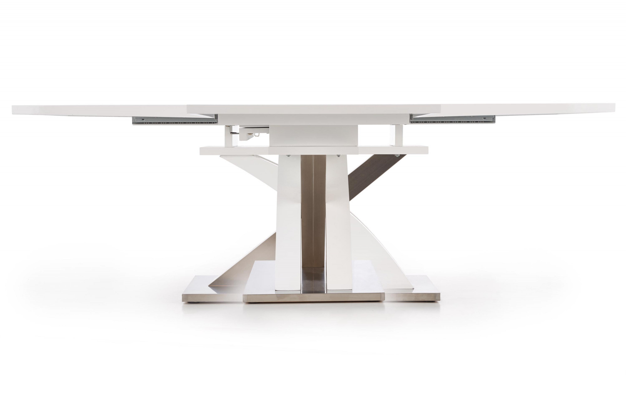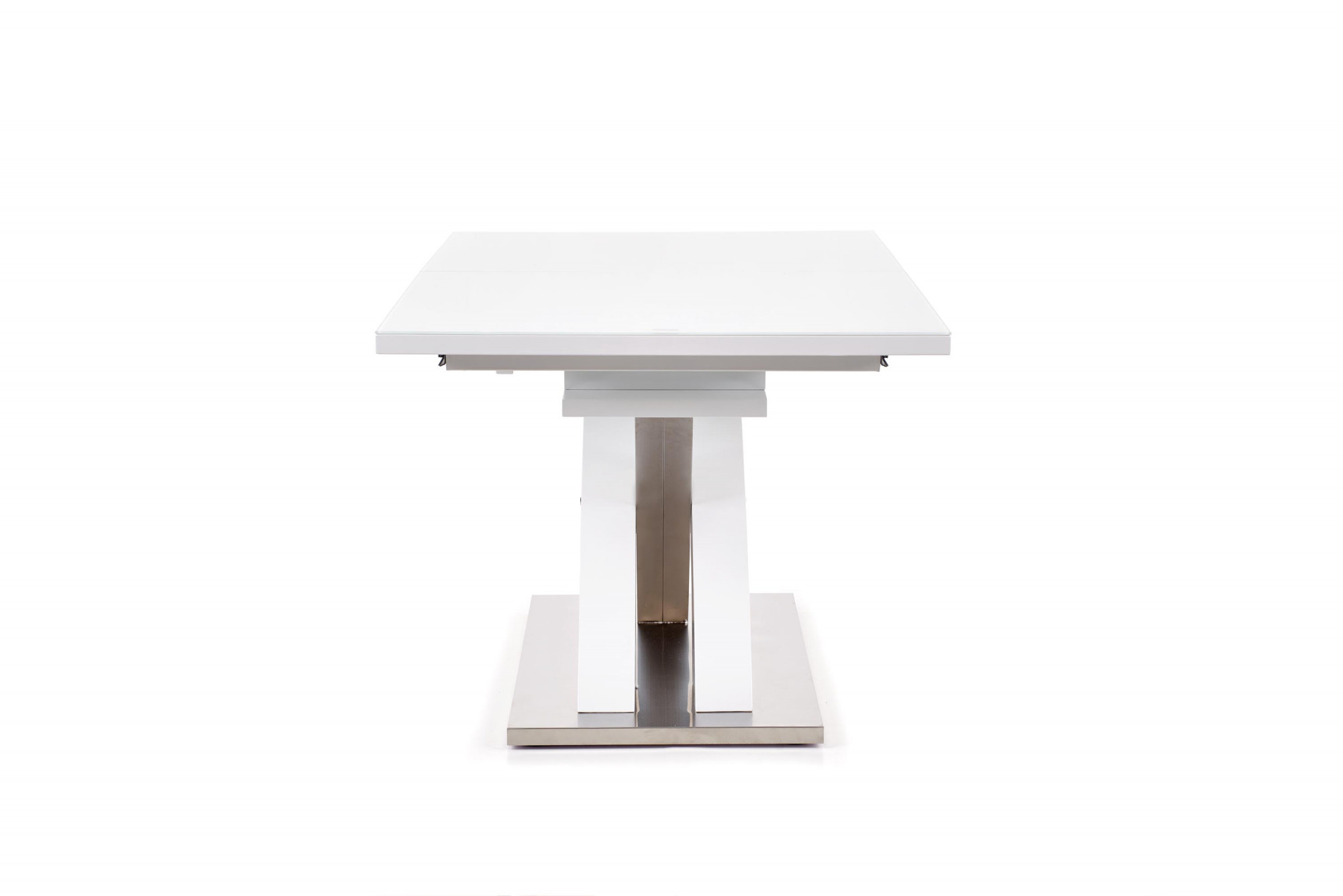 rozkládací stůl, rozměry: 160÷220/90/78 cm, materiál: sklo / lakovaná MDF / nerezová ocel, barva: sklo - extra bílá, MDF - bílá
