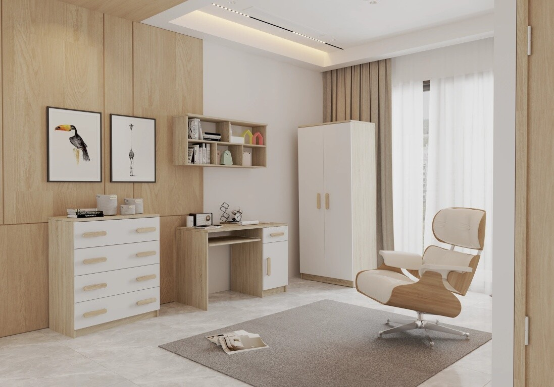 Moderní řada nábytku SMYK III potěší svou jednoduchostí a elegancí, kombinující barvu korpusu v provedení Dub Sonoma a bílou barvou čel. Dalším prvkem, který odlišuje "Smyk III", jsou ozdobné dřevěné úchytky, které jsou k dispozici v různých barvách. Právě ty dodávají nábytku charakter a vytvářejí v dětském pokoji jedinečnou a jemnou atmosféru.