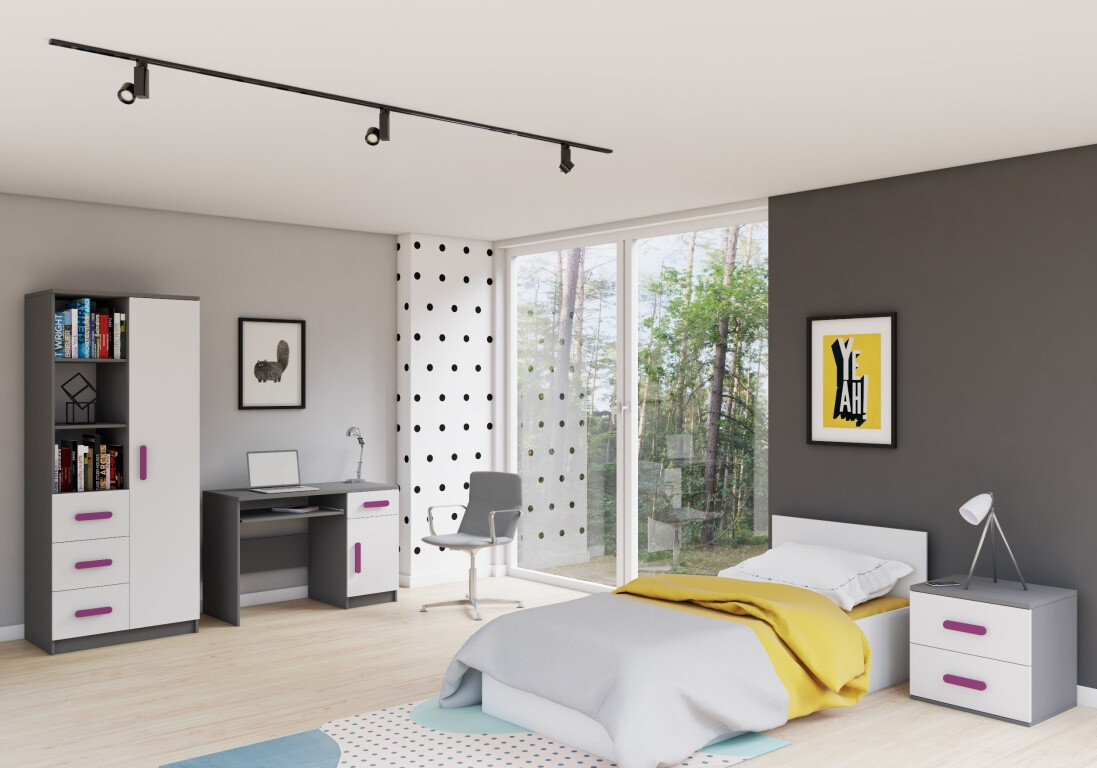 Moderní řada nábytku SMYK II potěší svou jednoduchostí a elegancí, kombinující klasickou šedou barvu korpusu a bílou barvou čel. Dalším prvkem, který odlišuje "Smyk II", jsou ozdobné dřevěné úchytky, které jsou k dispozici v různých barvách. Právě ty dodávají nábytku charakter a vytvářejí v dětském pokoji jedinečnou a jemnou atmosféru.