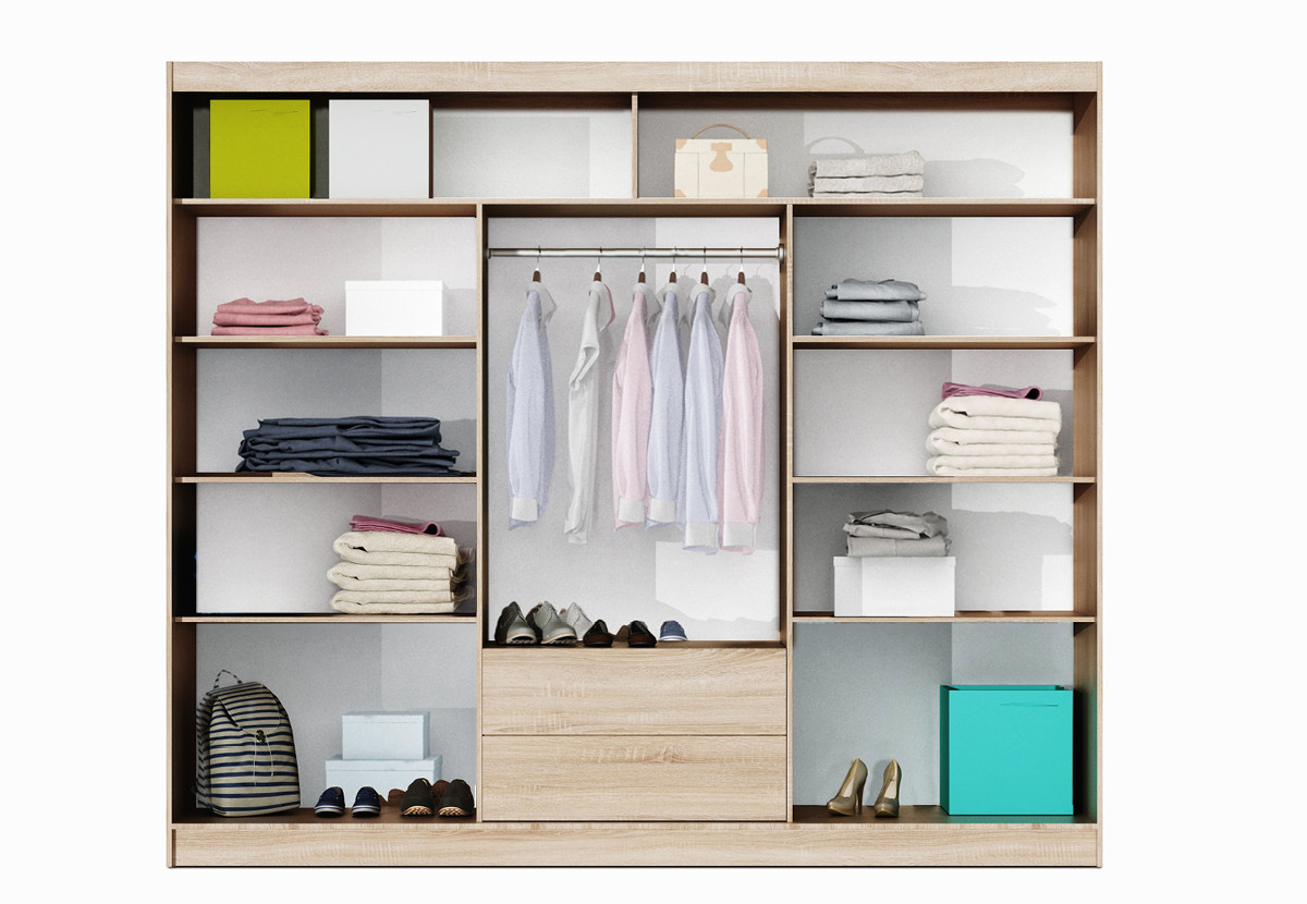 : Spodní vodící kolečka s ložisky, aluminiové kolejnice, led osvětlení, police, 2 šuplíky