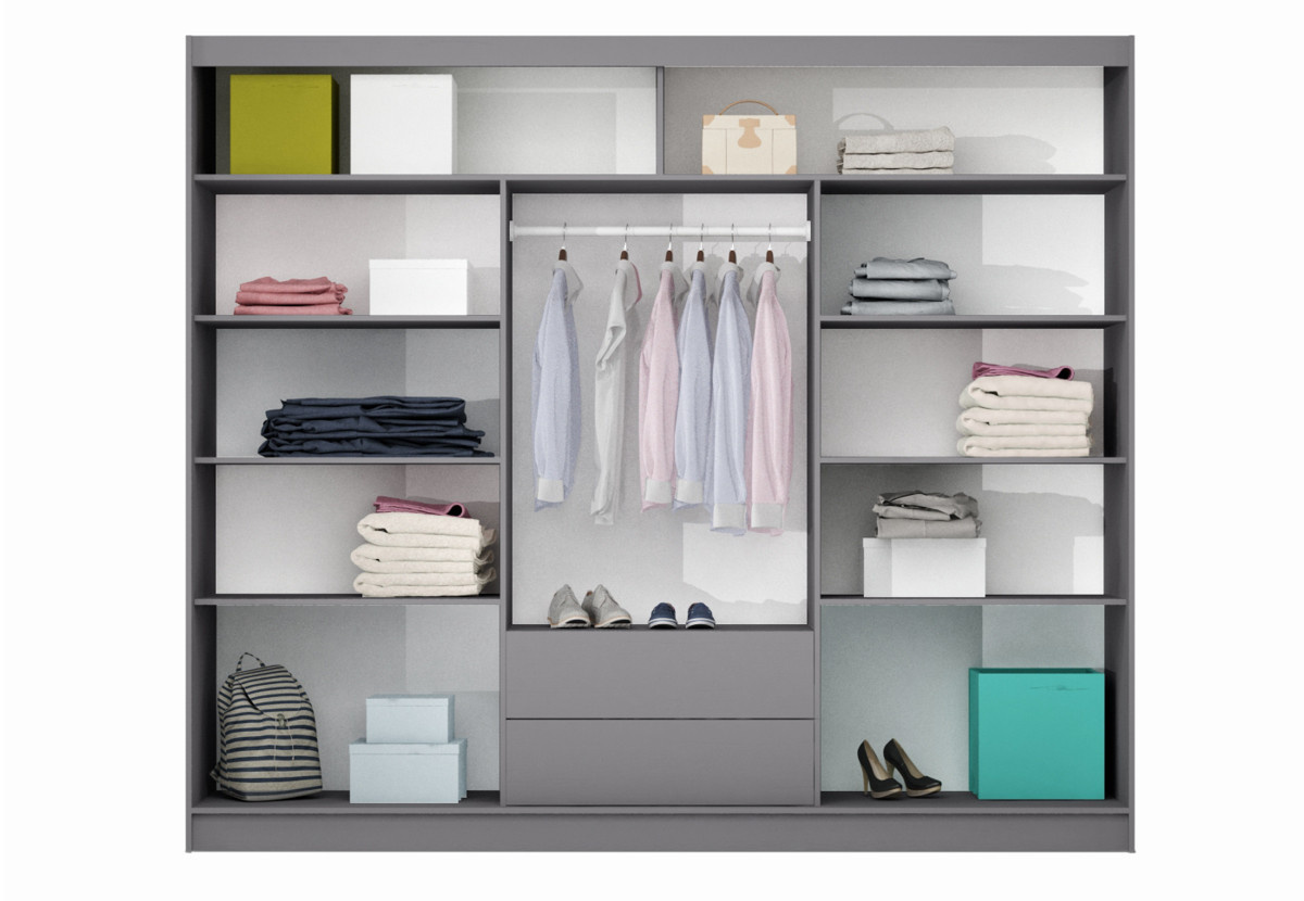 : Spodní vodící kolečka s ložisky, aluminiové kolejnice, 1 tyč na zavěšení oblečení, police, 2 šuplíky