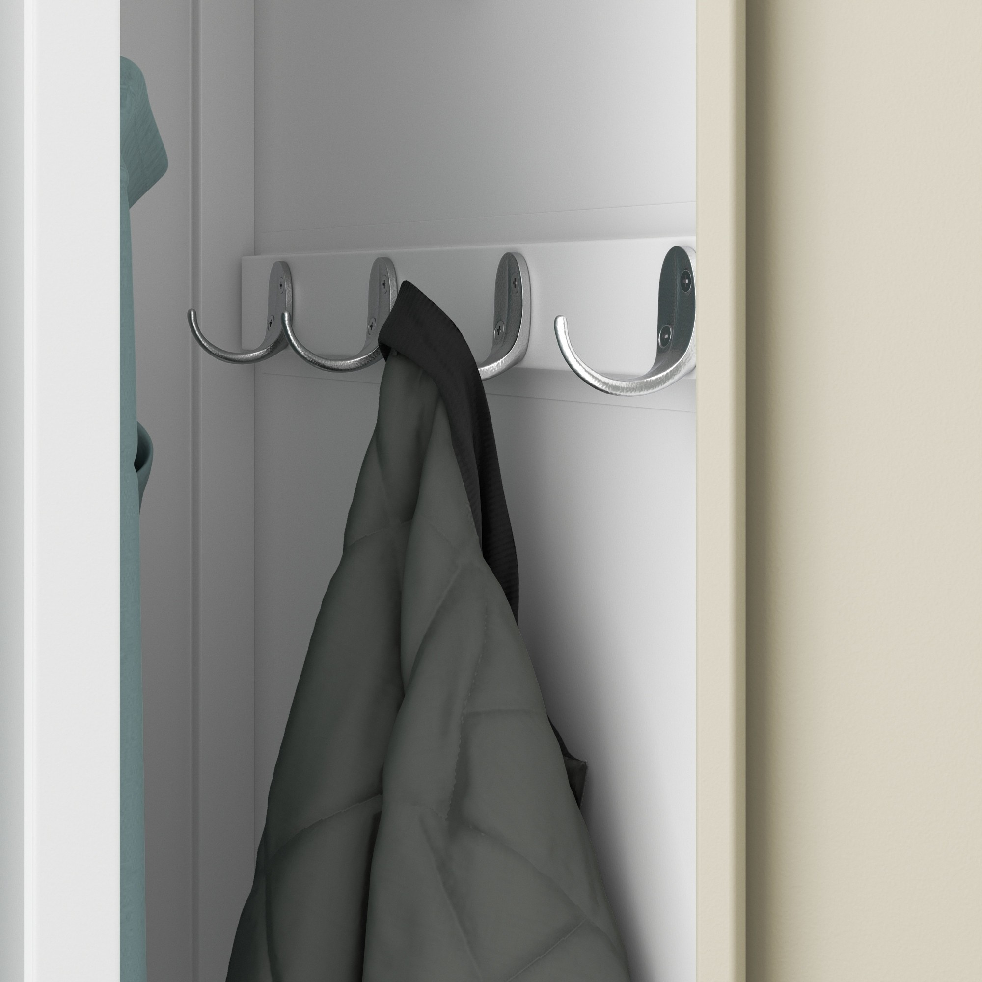 - Prostorná a funkční: Až čtyři hluboké komory s tyčemi na ramínka a dělicími příčkami, dvě samostatné police a háčky na oblečení poskytují překvapivě mnoho úložného prostoru.
