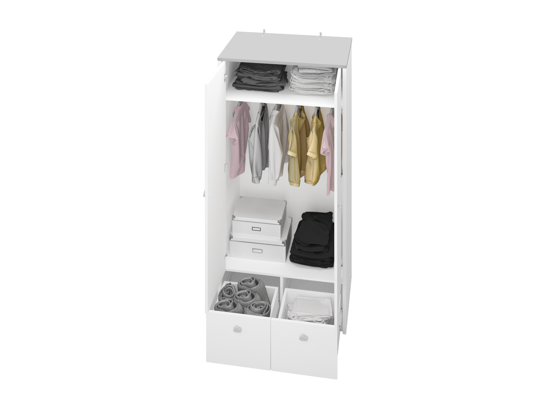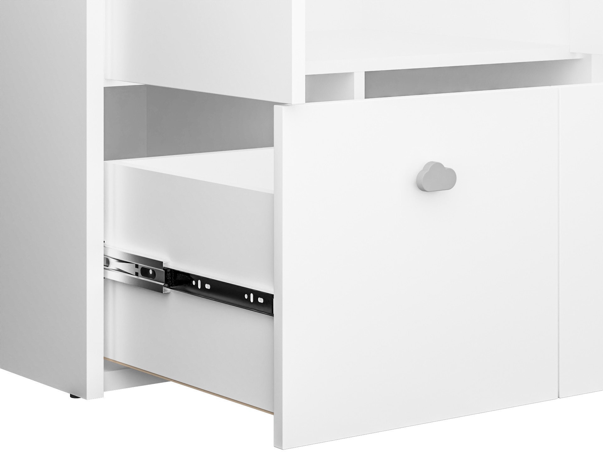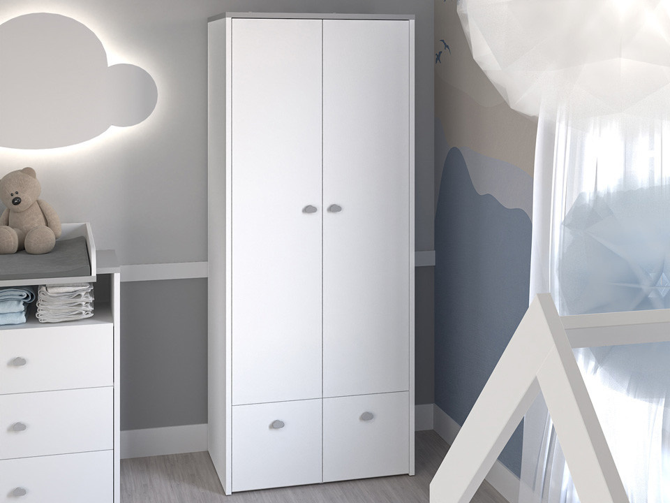 Šatní skříň LOEN 01 je kombinací modernosti a funkčnosti. Objemná šatní skříň překvapí ergonomickým prostorem, který pojme všechny potřebné věci a oblečení. Šatní skříň LOEN 01 je kus nábytku, který dokonale zapadne do každého dětského koutku. Šatní skříň má velmi robustní tyč na ramínka, dvě prostorné zásuvky a širokou polici, která vám umožní bez problémů uložit dětské oblečení i doplňky. Skříň navíc vyniká krásnými gumovými úchytkami ve tvaru obláčku. Bílá a šedá barva zajistí volnost designu a snadno umožní zařídit dívčí i chlapecký pokoj.