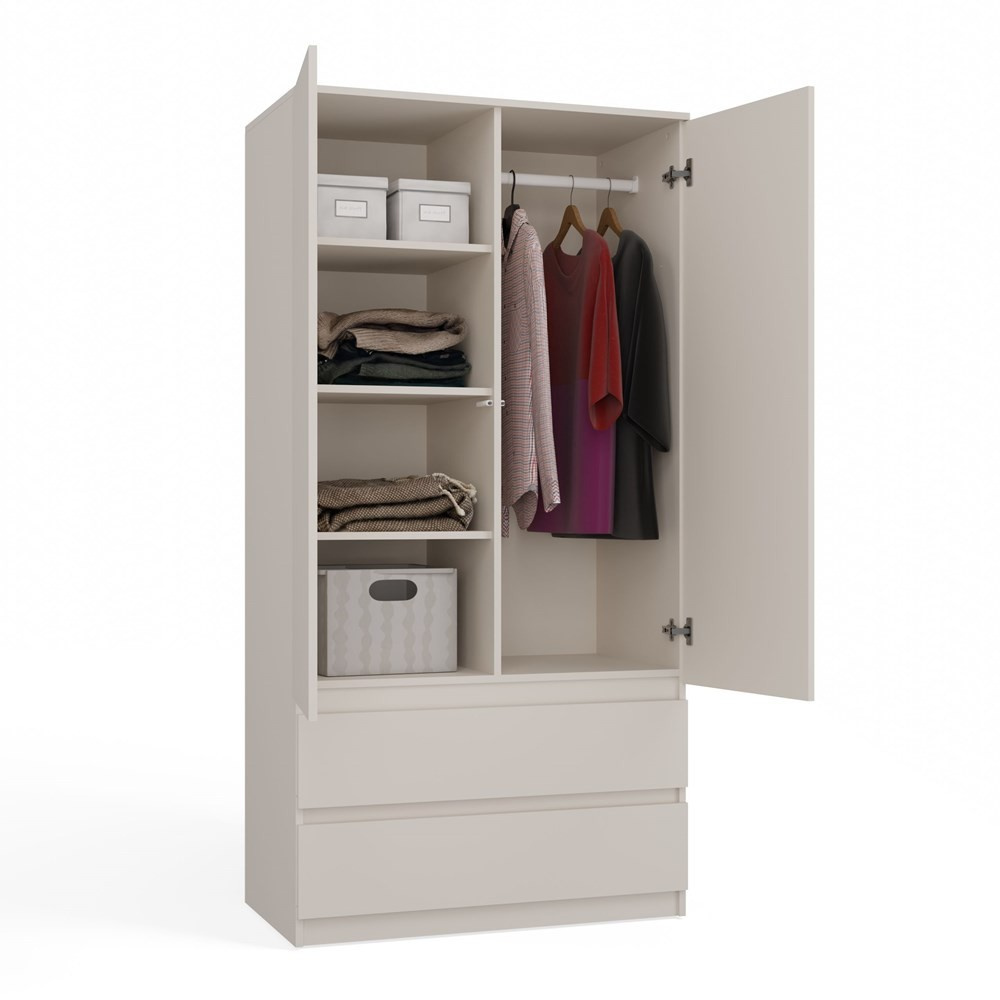 Šatní skříň Malvína v trendy barvách a moderním designu je praktický kus nábytku, který najde své uplatnění v ložnici, dětském pokoji, ale také v kanceláři nebo domácí pracovně. Nabízí dostatek úložného prostoru s možností instalace polic nebo šatní tyče v závislosti na vašich požadavcích. Dvířka se systémem TIP-ON se otevírají po jemném zatlačení čela dvířek. Nábytek je vyroben z nejkvalitnější laminované desky odolné proti poškrábání a vlhkosti, hrany jsou zakončené ABS materiálem.