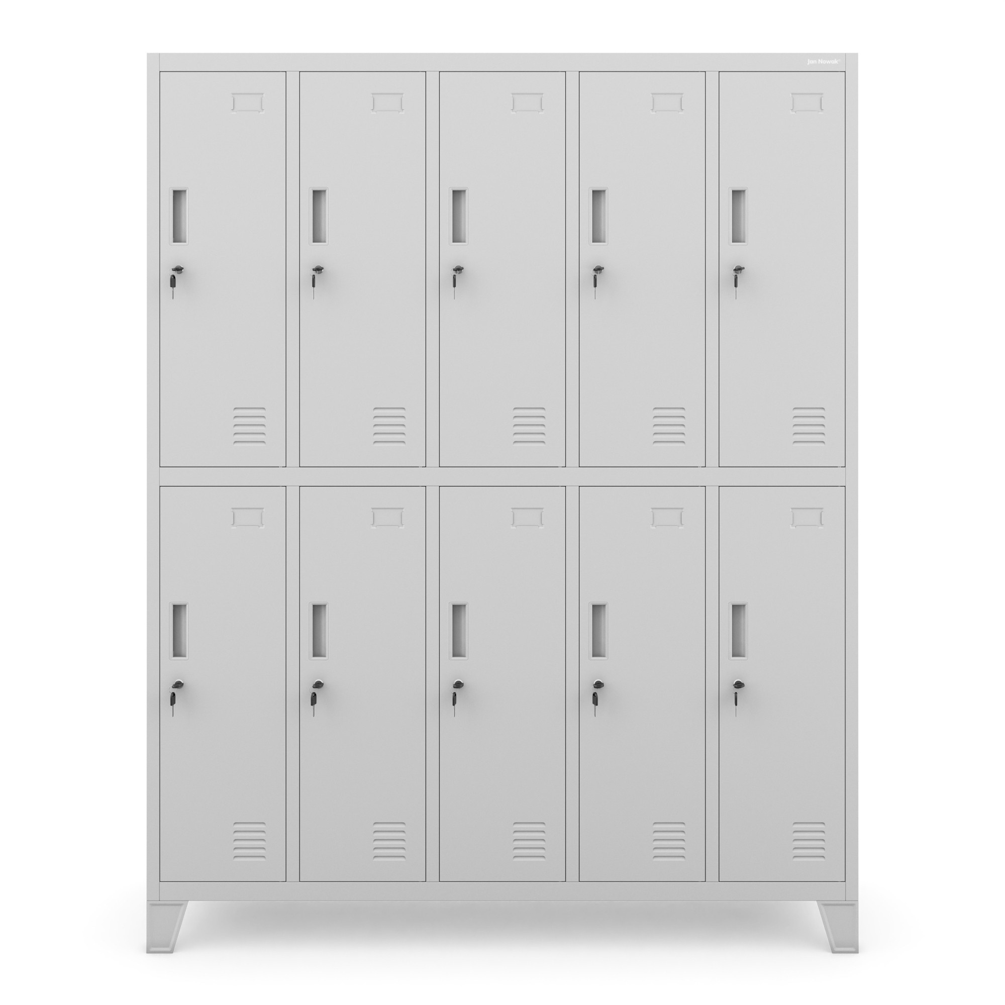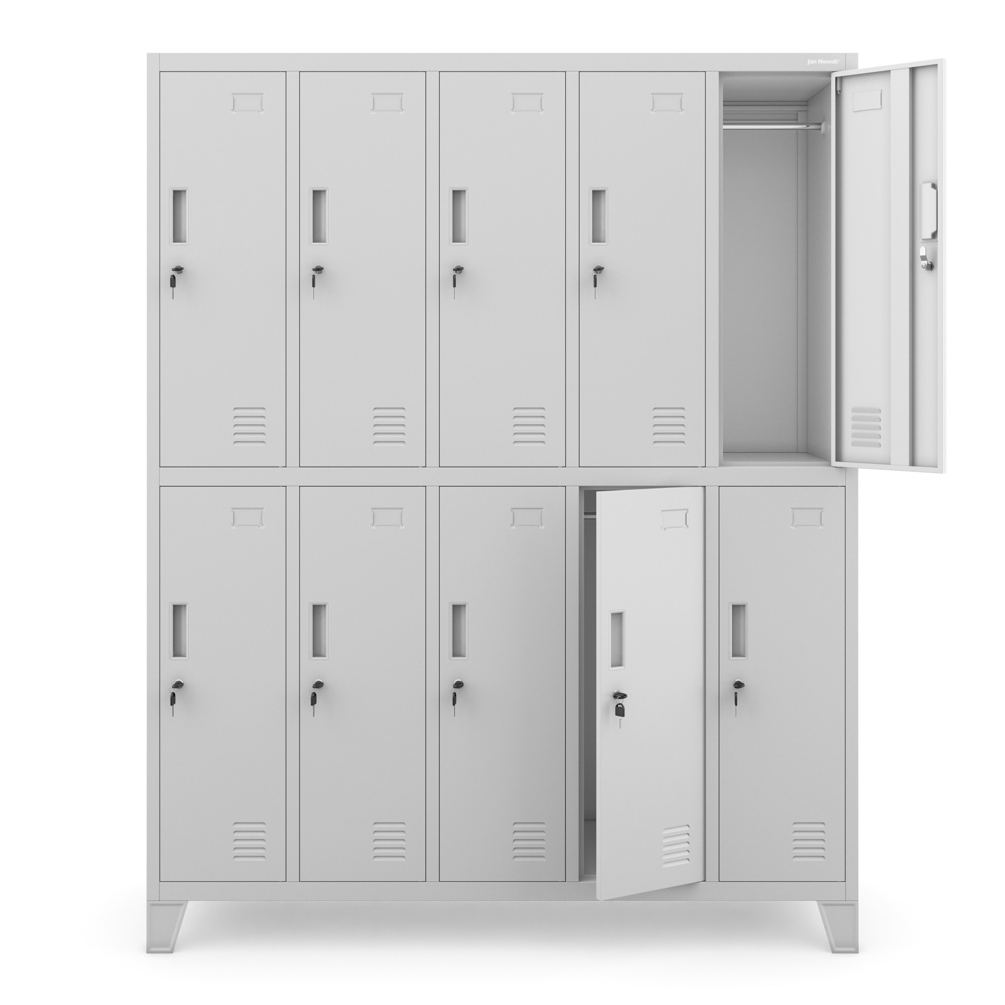 - Prostorné a praktické uspořádání: Skříň BARTEK nabízí 10 samostatných skříňek, které poskytují dostatek prostoru pro uložení oblečení, pracovního oděvu, nářadí, osobních předmětů a dokumentů. Každá skříňka je vybavena tyčí na zavěšení ramínek, což usnadňuje organizaci a udržování pořádku.