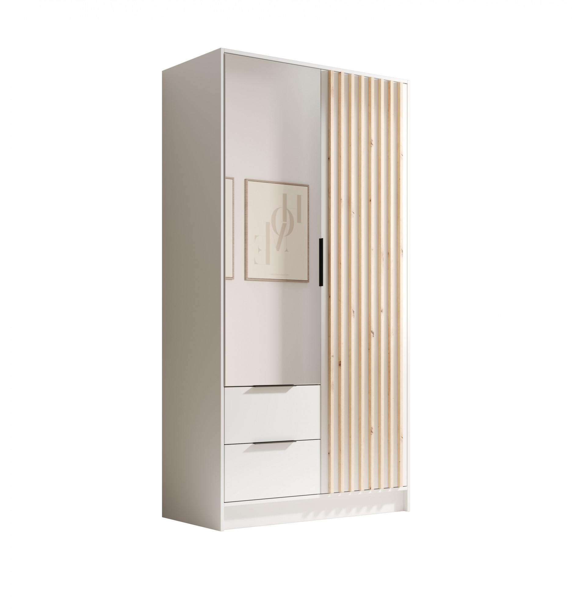 Šatní skříň Neri – elegantní a funkční skříň, která se dokonale hodí do moderních i klasických interiérů. Díky široké škále barev si každý najde verzi, která dokonale ladí s jeho stylem. Skříň Neri se vyznačuje dekorativními lamelami na čelních stranách a velkým zrcadlem, které opticky zvětší prostor a dodá mu lehkost.Skříň je k dispozici ve třech praktických velikostech:- 100 cm – kompaktní, ideální pro menší prostory,- 150 cm – vynikající kompromis mezi prostorem a velikostí,- 200 cm – prostorná varianta, ideální pro uložení většího šatníku.Každá z verzí byla navržena s ohledem na pohodlí uživatele a estetiku, která obohatí každou ložnici nebo šatnu.