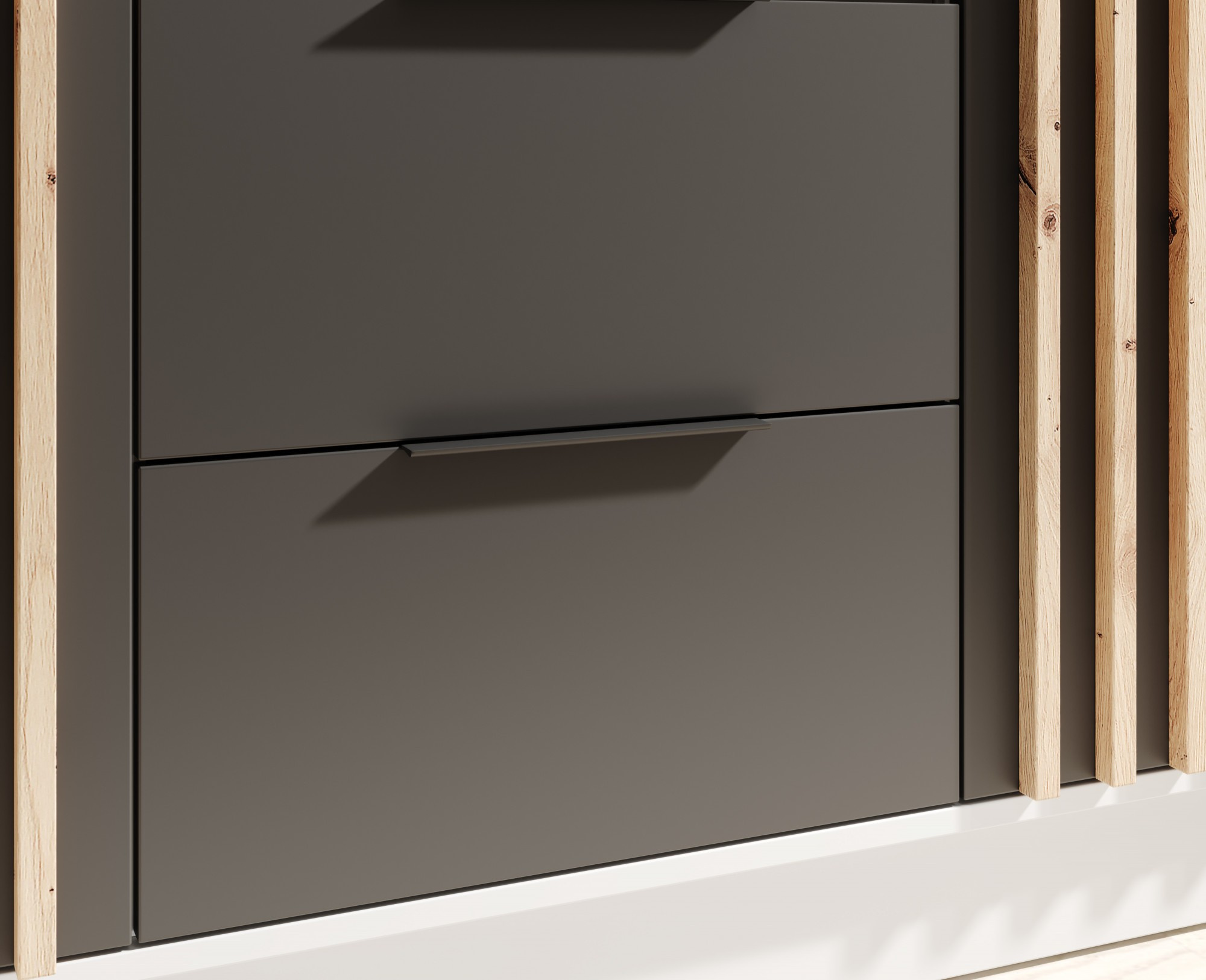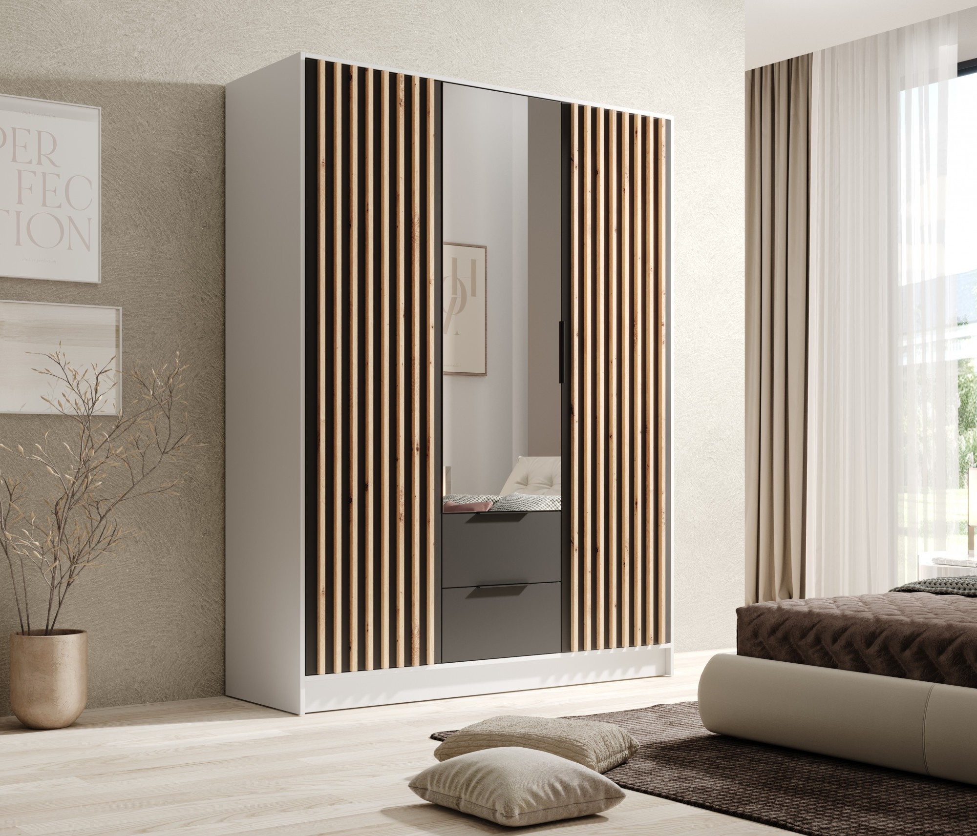 Šatní skříň Neri – elegantní a funkční skříň, která se dokonale hodí do moderních i klasických interiérů. Díky široké škále barev si každý najde verzi, která dokonale ladí s jeho stylem. Skříň Neri se vyznačuje dekorativními lamelami na čelních stranách a velkým zrcadlem, které opticky zvětší prostor a dodá mu lehkost.Skříň je k dispozici ve třech praktických velikostech:- 100 cm – kompaktní, ideální pro menší prostory,- 150 cm – vynikající kompromis mezi prostorem a velikostí,- 200 cm – prostorná varianta, ideální pro uložení většího šatníku.Každá z verzí byla navržena s ohledem na pohodlí uživatele a estetiku, která obohatí každou ložnici nebo šatnu.