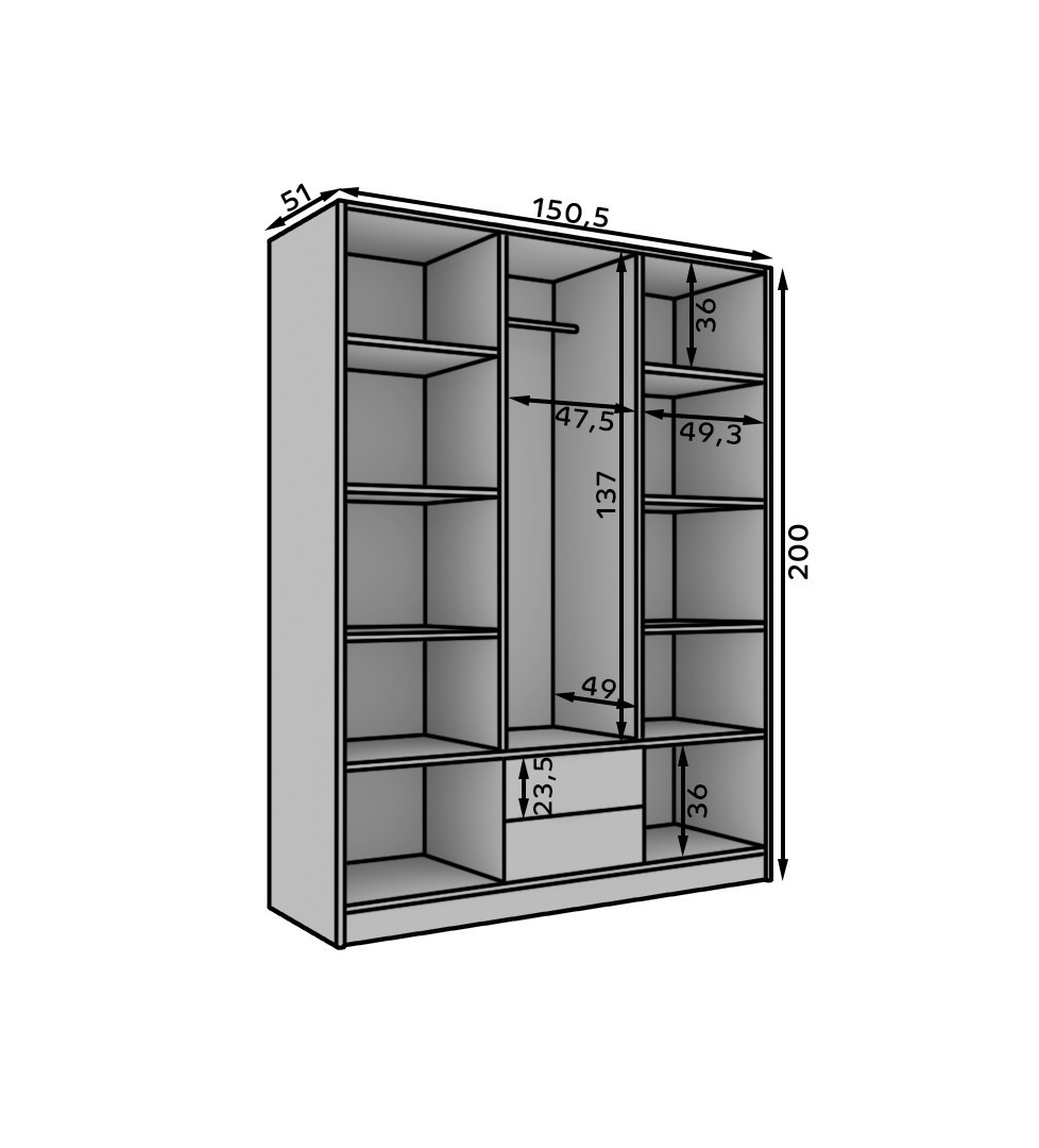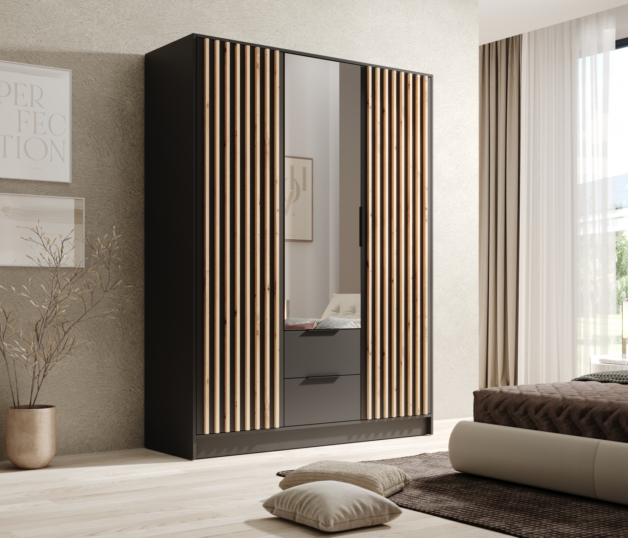 Šatní skříň Neri – elegantní a funkční skříň, která se dokonale hodí do moderních i klasických interiérů. Díky široké škále barev si každý najde verzi, která dokonale ladí s jeho stylem. Skříň Neri se vyznačuje dekorativními lamelami na čelních stranách a velkým zrcadlem, které opticky zvětší prostor a dodá mu lehkost.Skříň je k dispozici ve třech praktických velikostech:- 100 cm – kompaktní, ideální pro menší prostory,- 150 cm – vynikající kompromis mezi prostorem a velikostí,- 200 cm – prostorná varianta, ideální pro uložení většího šatníku.Každá z verzí byla navržena s ohledem na pohodlí uživatele a estetiku, která obohatí každou ložnici nebo šatnu.